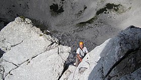 Am besten über die Abseilpiste abseilen (siehe Topo).