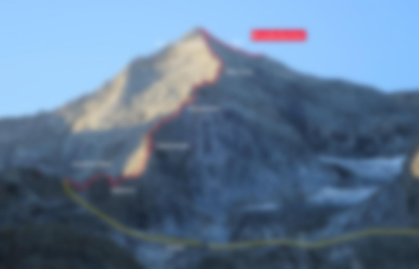 Vom Anseilplatz bei der Stange ca. 60 m (bis 2) einen flachen Pfeiler hinauf bis hinter den gespaltenen Block. Dem schmalen Grat wenige Meter folgen und links auf Rampe absteigen und auf ihr zu kleinem Pfeiler mit Schlinge, hier ca. 3 m abklettern (4) und dem leichten Grat zu Stand bei NH folgen. Leicht über den nächsten Grataufschwung (event. Zwischenstand auf diesem) hinein in die nächste mit Rissen durchzogene Gratzone. Gerade über Risse hinauf zu Block mit Schüsselstelle (NICHT links diesen Bock umgehen!). Im Zick-Zack (6) über den Block zu Stand bei 2 NH. Es folgen zwei leichte Seillängen bis zum Adlerschnabel. Über den Schnabel (Platten mit feinen Risschuppen, 5+) hinweg und eine leicht und eine schwerere Riss-Seillänge hinauf unter den nächsten steilen Grataufschwung. Über diesen entweder direkt, steil und griffig mit Schuppen hinauf (4), oder diesen rechts umgehen. Danach 50 m (3) am Grat zum Roten Turm und diesem im Zick-Zack überwinden (2 NH, 4). Es folgen drei 5- Risslängen am Grat zur zweiten Schlüsselstelle. Davor guter Stand mit 3 NH und einem fixen Keil. Von hier gerade hinauf zu einer überhängende Schuppe mit Klemmblock und weiter über einen feinen Riss zum Grat unter einen mark. Ausbruch (1 NH). Hier entweder direkt über den Ausbruch (brüchig, 5- ) hinauf oder den Ausbruch in einer Rechtsschleife umgehen, Stand an Friends/Keilen am Grat. Weiter 50 m leicht hinauf zum Gipfelgrat, dem man nach rechts zum Gipfel des Grundschartners hinauf.