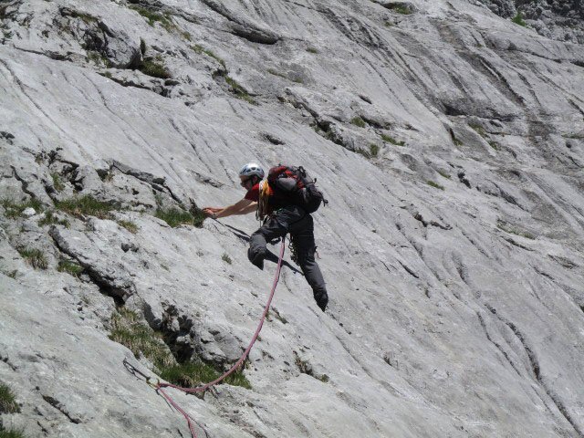 Vom Ausstieg über die sogenannte "Blaue Markierung" im äußerst unangenehmen Steilgelände (zuerst Schrofen, später brüchige Rinnen, fast ausschließlich Klettergelände bis 2+) zum Aufstiegsweg absteigen und über diesen zurück ins Tal.