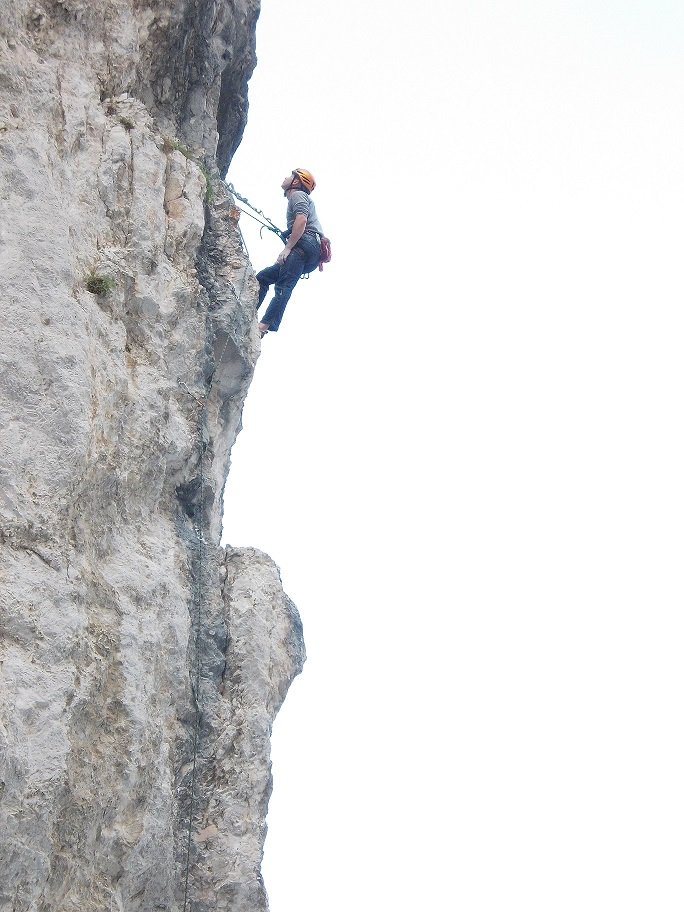 Gut abgesicherte Alpinroute mit teils brüchigen Fels.