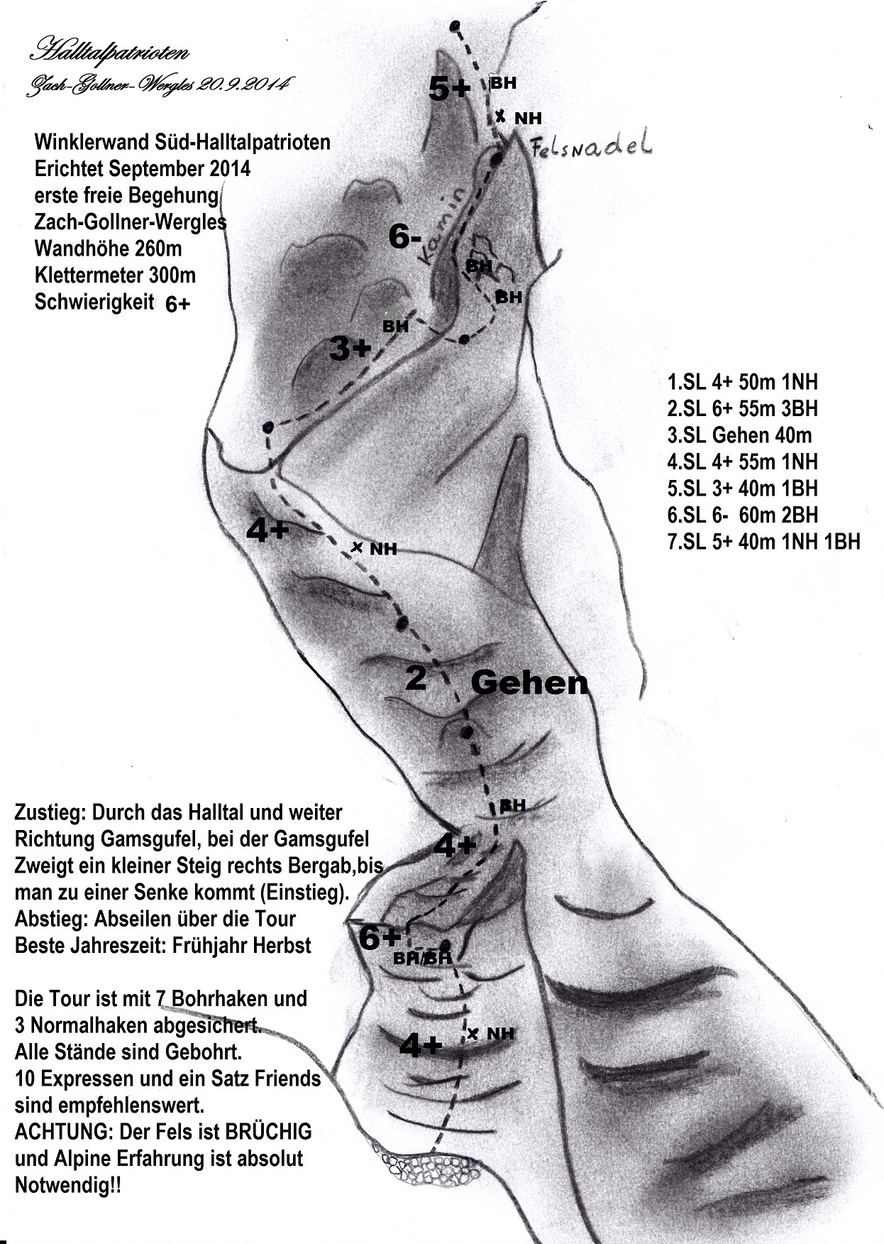 Die Tour ist mit 7 Bohrhaken und 3 Normalhaken abgesichert. Alle Stände sind gebohrt.