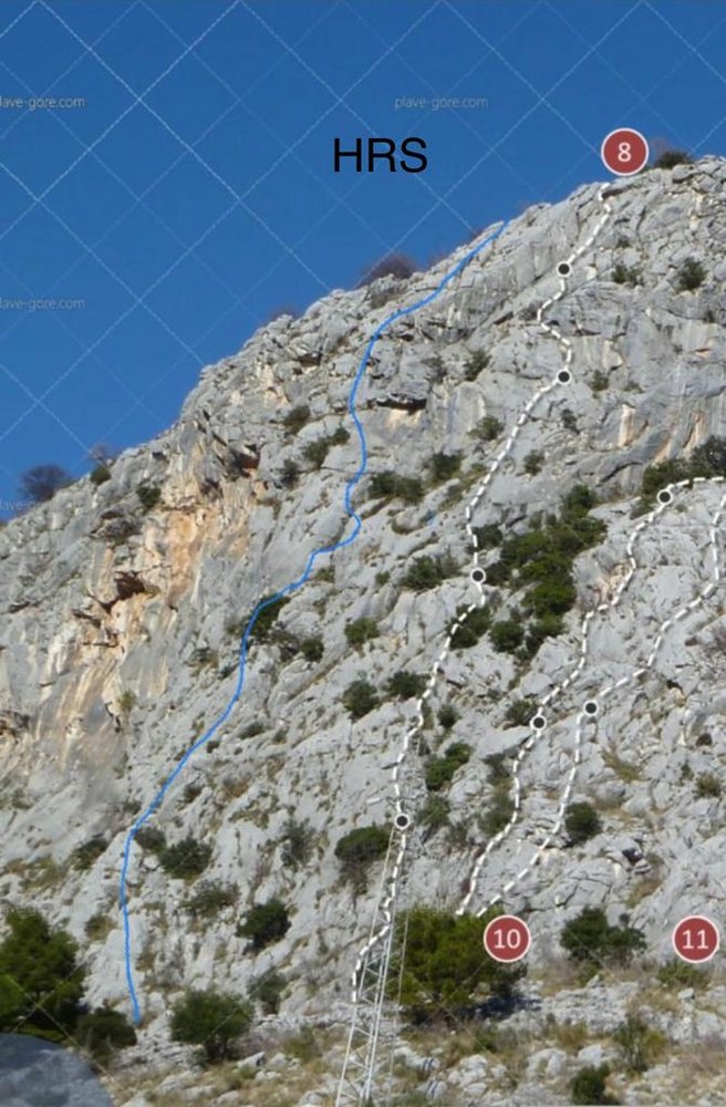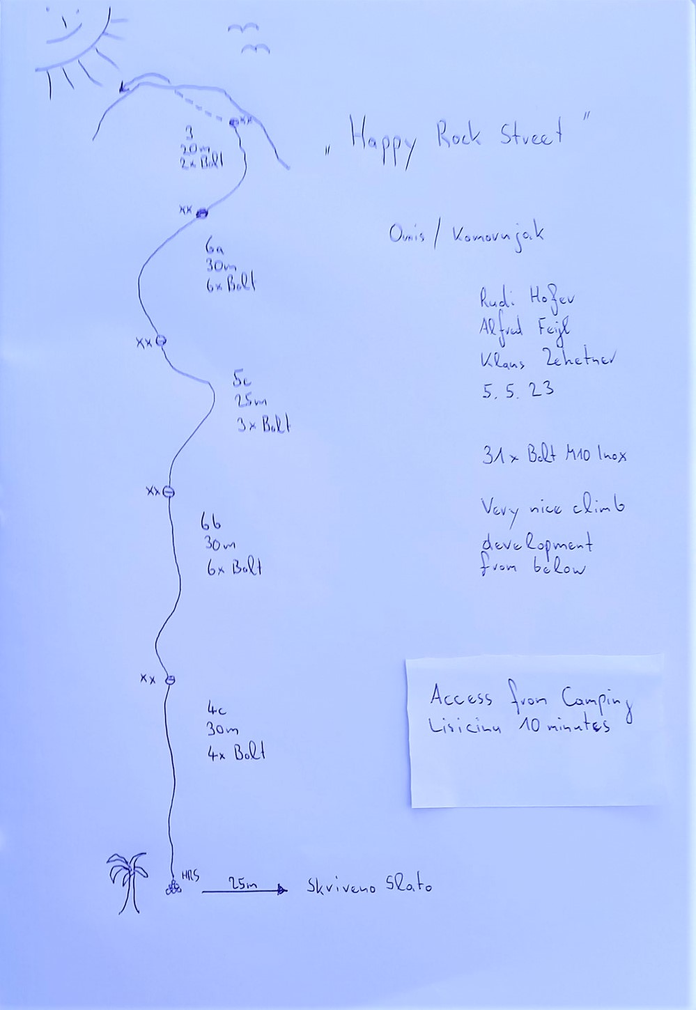 Omis von der Villa Dvor zurück und zum Camping Lisicina. Hier auf den Wanderweg zum Komornjak. Diesem folgt man zur zweiten Kehre nach links steht eine grüne Rastbank, ca, 40 m nach dieser Kehre verlässt man den Weg und steigt gerade hinauf (25m) zum Wandfuß.