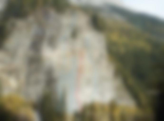 Vom Parkplatz auf der alten Straße in 3 min unter die sichtbare Wand. Der Einstieg der Route ist ziemlich in der Mitte des direkt von der Straße wegführenden Wandteils. Der Name der Tour ist angeschrieben.