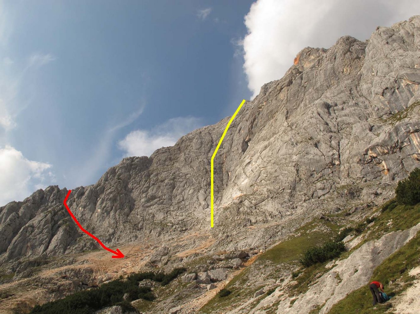 Vom Gh. Obermayerberg auf dem Weg zur Jagdhütte Hochgscheid (1386 m). Ca. 100 m hinter der Hütte (vor dem großen Bachbett)geht links ein sichtbarer Steig ab, dem man bis zur Wandstufe unter dem Häuselhorn folgt. Rechts in eine Wiesen-Rinne, die man kurz vor dem Ende nach links durch Latschengassen wieder verlässt. Dann weglos, immer leicht links haltend aufwärts unter die Südwand. Unter der Wand nach links bis zu einer Schlucht queren (Rucksackdepot, dort wo es steil wird, auf ca. 1900 m). Danach am linken Schluchtrand (Stelle 2, rote Punkte) zu einer flachen Wasserrillenplatte (20 m links der Schlucht; 2 Bohrhaken).