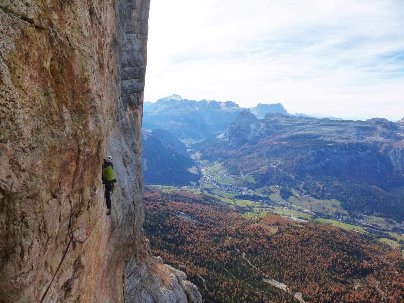 Der Heiligkreuzkofel (2907 m) ist der große Blickfang hoch über dem Gadertal und über Alta Badia. In seiner imposanten Westwand wurde mehrfach Klettergeschichte geschrieben. Über den mittleren von drei prächtigen Pfeilern verläuft einer der absoluten Klassiker dieser Wand, der „Mittelpfeiler“. Erstbegangen von keinen geringeren als Reinhold und Günther Messner im Jahre 1968. Einen fast schon magischen ja legendenhaften Ruf hat die sogenannte „Messner-Platte“ und es ranken sich viele Geschichten und Vermutungen darum. Es wurde schon viel über diese 4 Meter geschrieben, gestritten und diskutiert. Insbesondere eine Rotpunkt-Begehung der heute mit VIII (Ivo Rabanser) bewerteten „Messner-Platte“ ist das große Ziel vieler guter Alpinkletterer. Früher wie heute! Reinhold Messner hat hier somit bereits 1968 (!!!) das Tor zum VIII Grad im alpinen Gelände aufgestoßen. Mit dicken Bergschuhen...!
