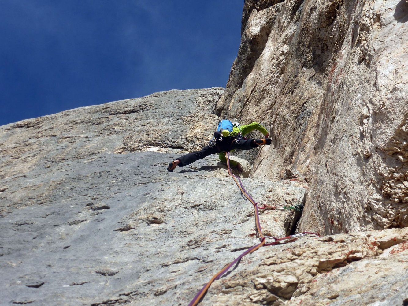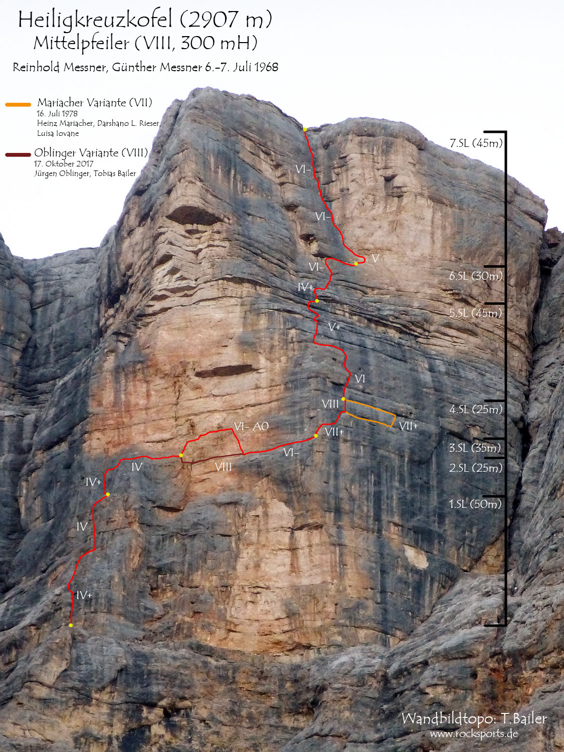Die 2. Begeher um Heinz Mariacher umgingen 1978 die Messner Platte und eröffneten die etwas leichtere „Mariacher Variante“ (VII+).