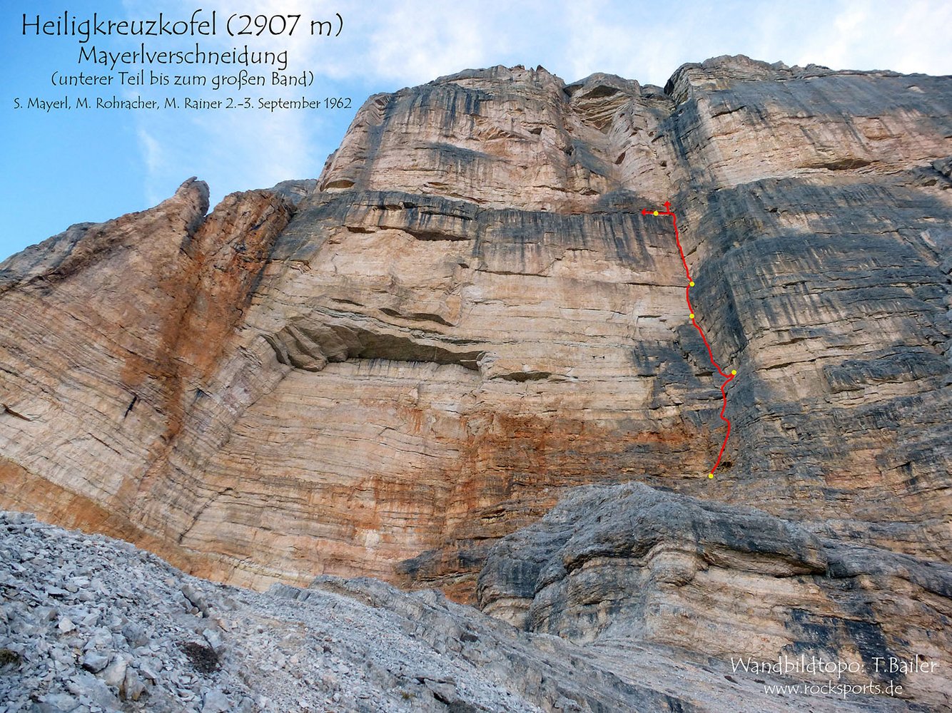 1. Mayerlverschneidung: Auf dem Weg Nr. 7 in Richtung Heiligkreuzkofel bis der Vorbau erreicht wird. Über den Vorbau in teils wildem Zick Zack und viel hin und her immer den zahlreichen Steinmännchen folgend zum Einstieg am Fuße der sehr markanten Mayerlverschneidung.