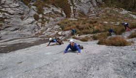 Die rechte der drei zentralen Platten-Plaisirtouren. Die Tour ist rechts nahe an einer Wasserspur - je nach Wassermenge auch Wasserfall - und deshalb vor allem oben oft nass. Wenn sie aber trocken ist, dann ist sie gleich gut wie die "Ethikkommison" oder die "Energiewende" und deshalb auch zu empfehlen. Der Fels ist oft so rau, so dass das wenige Wasser auch nicht so stört.
