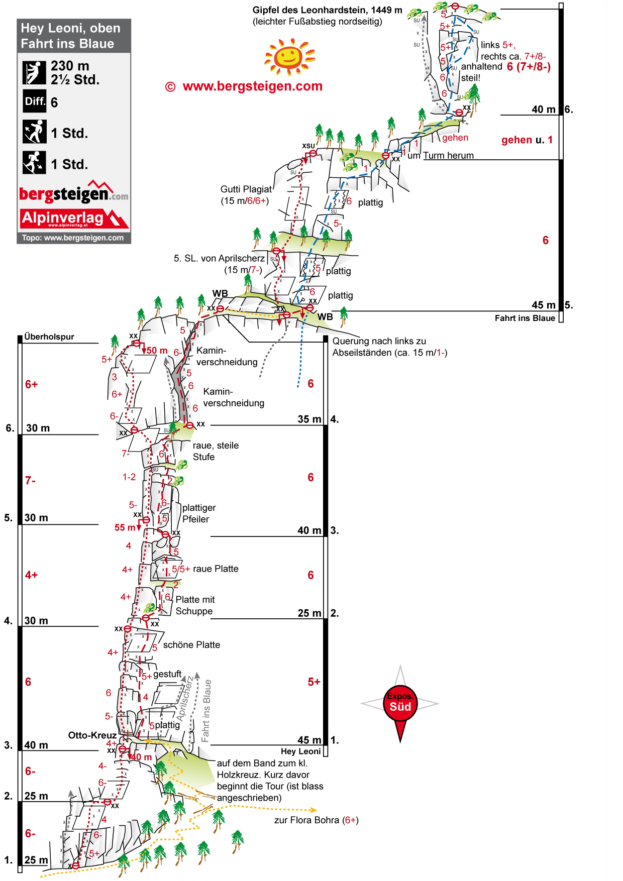 Schöne Genussklettertour im linken Teil der Südwand am Leonhardstein. Der Anstieg sucht sich den leichtesten Weg durch die Südwand und hört nach einem tollen Kamin auf einem Band auf. Wer weiter bis zum Gipfel will, kann noch zwei Seillängen der Route "Fahrt ins Blaue" anhängen und dann zu Fuß absteigen.