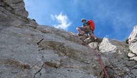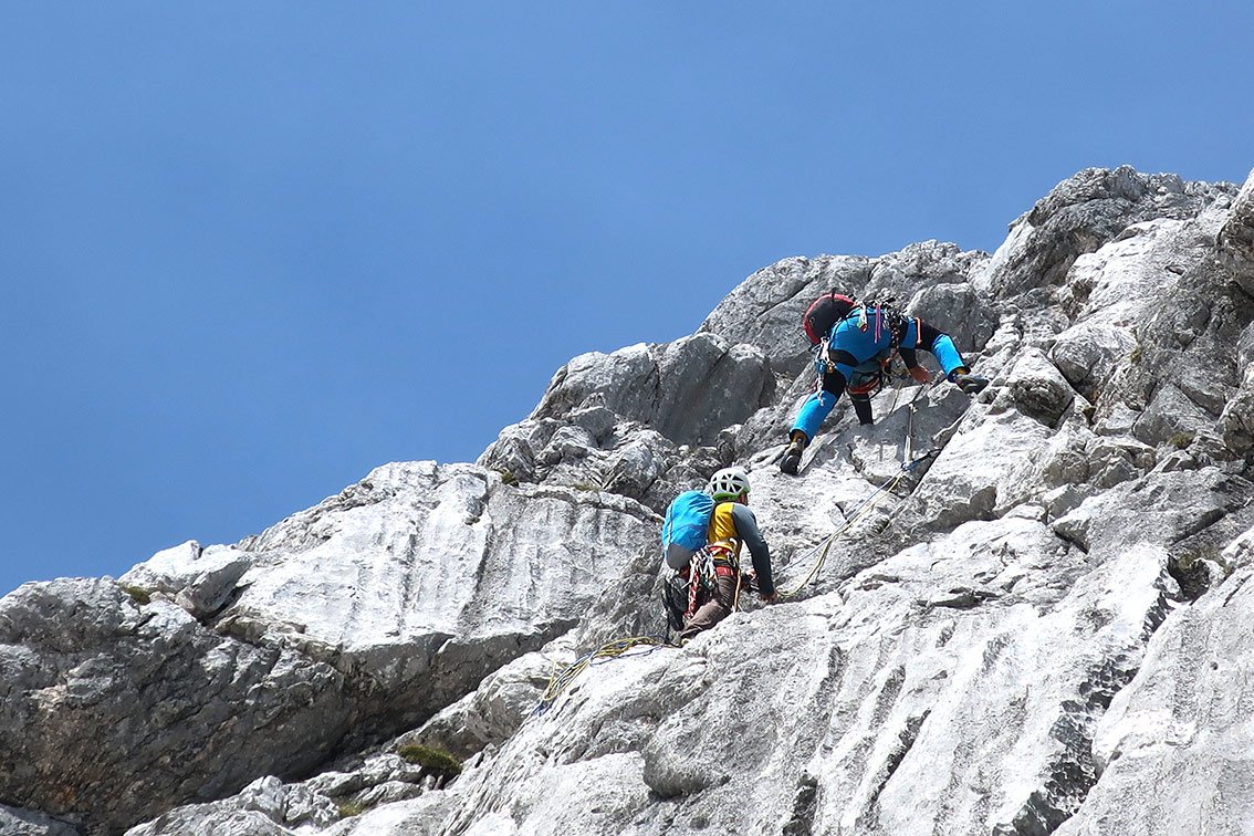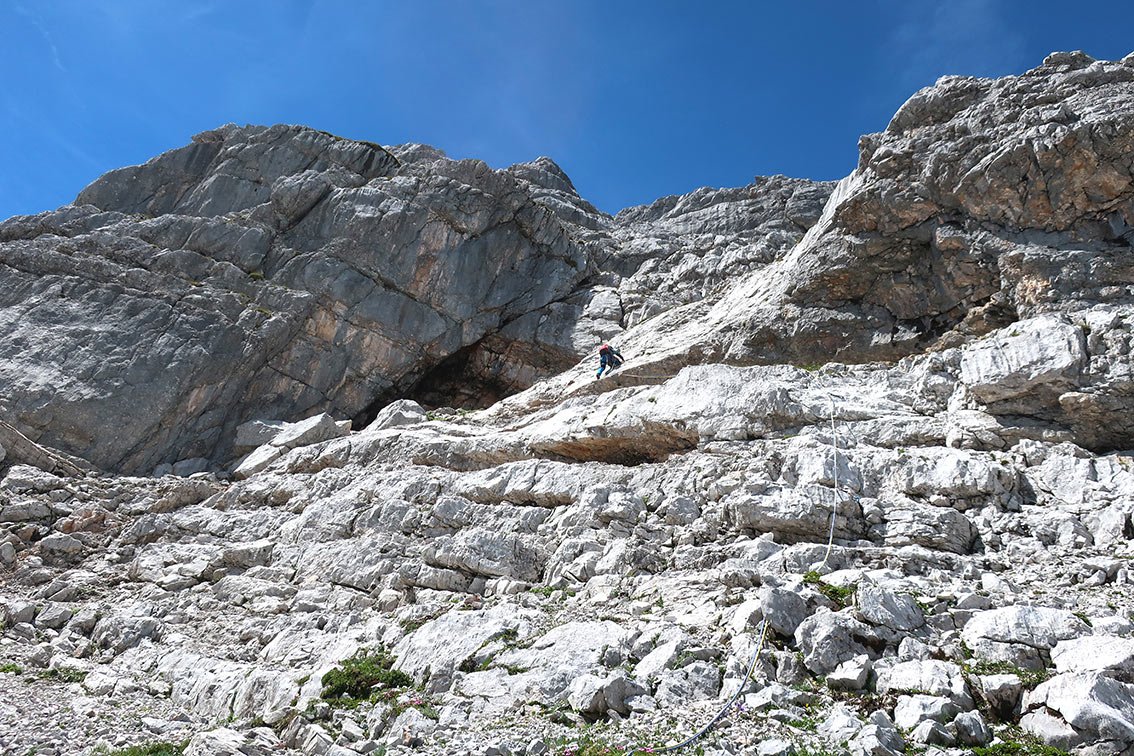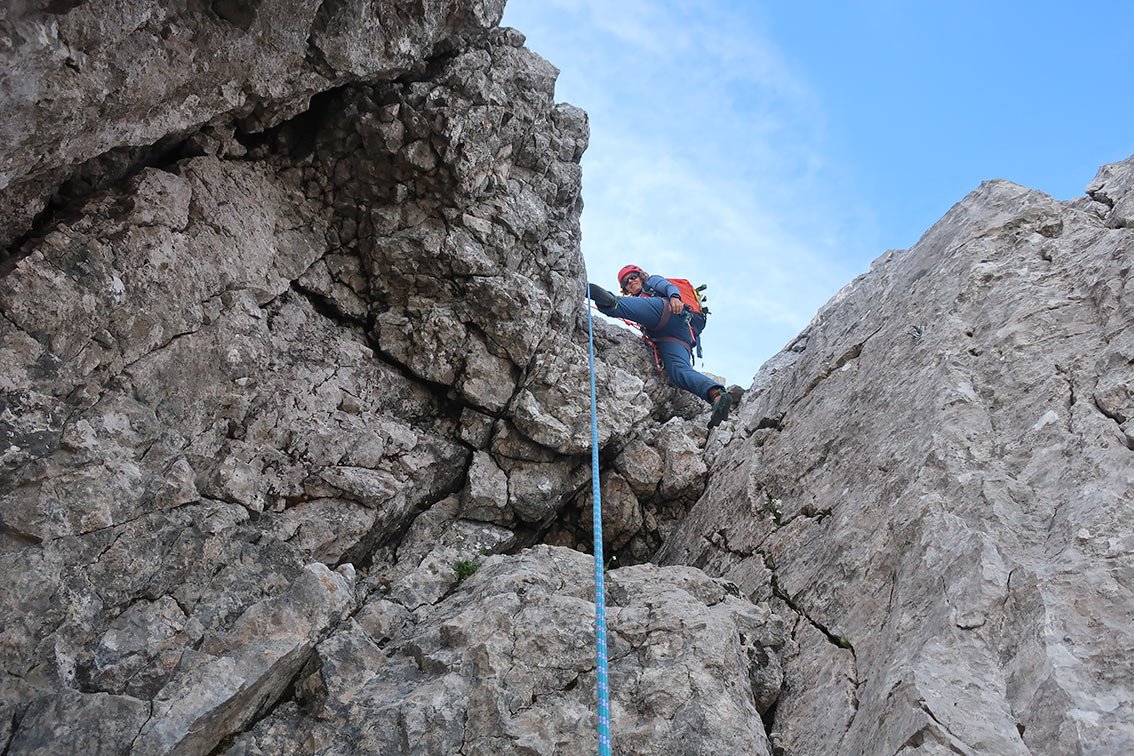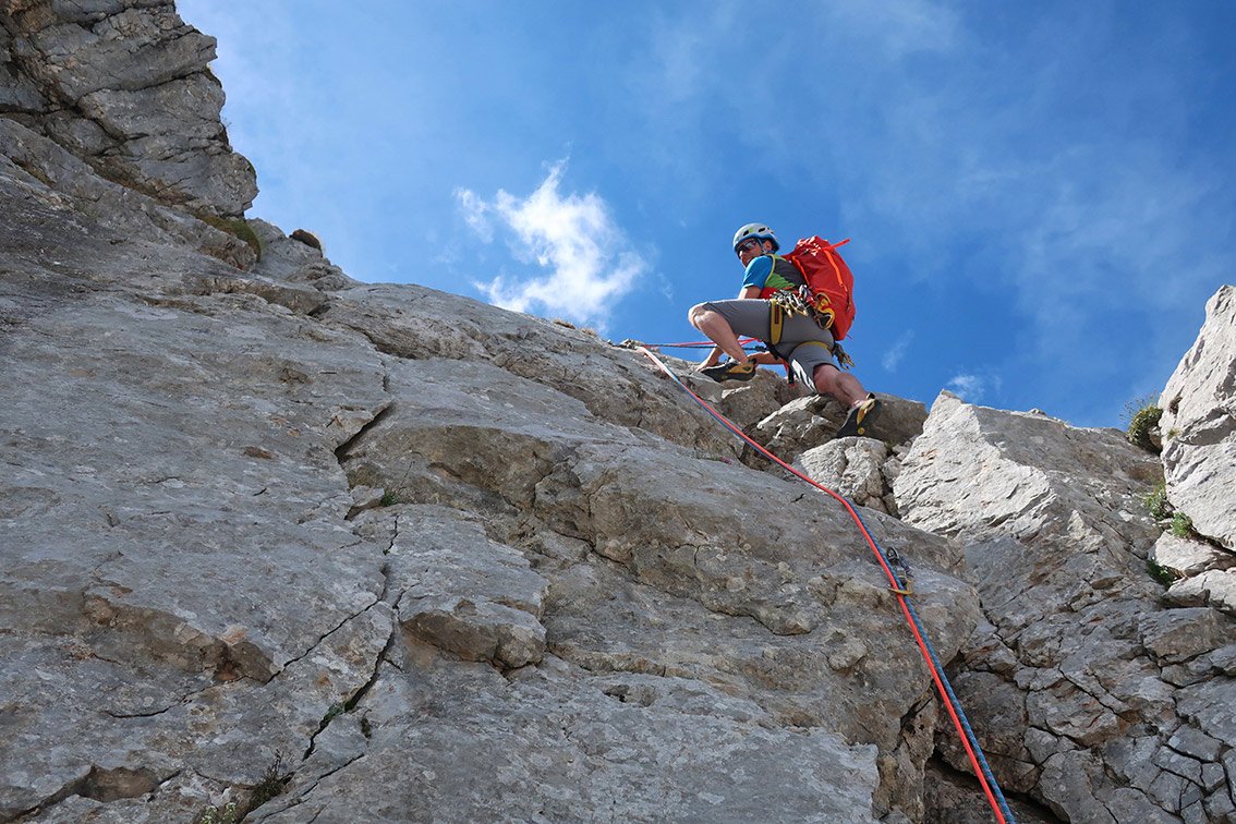 Wegen des brüchigen Felsens lässt man besser den versierteren Kletterer die letzten beiden Seillängen am scharfe Seilende vorsteigen.