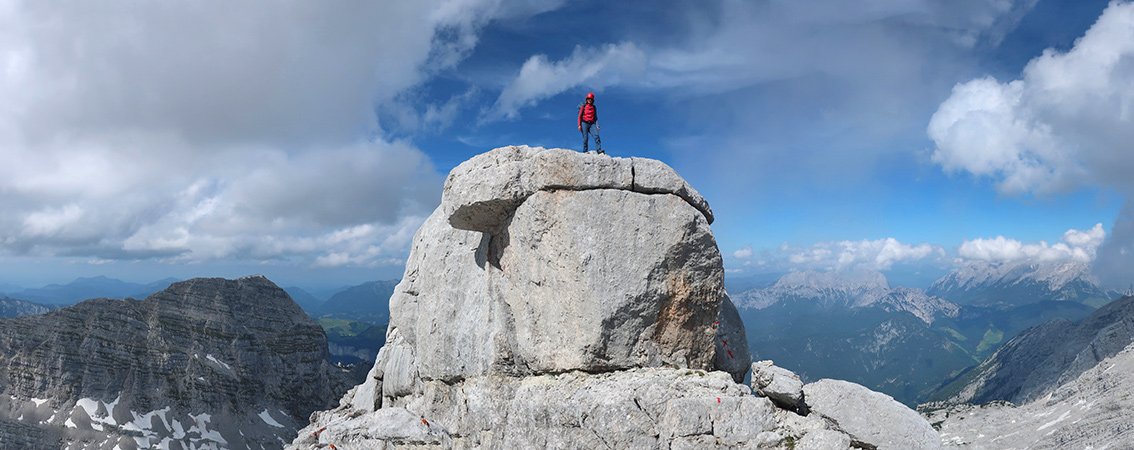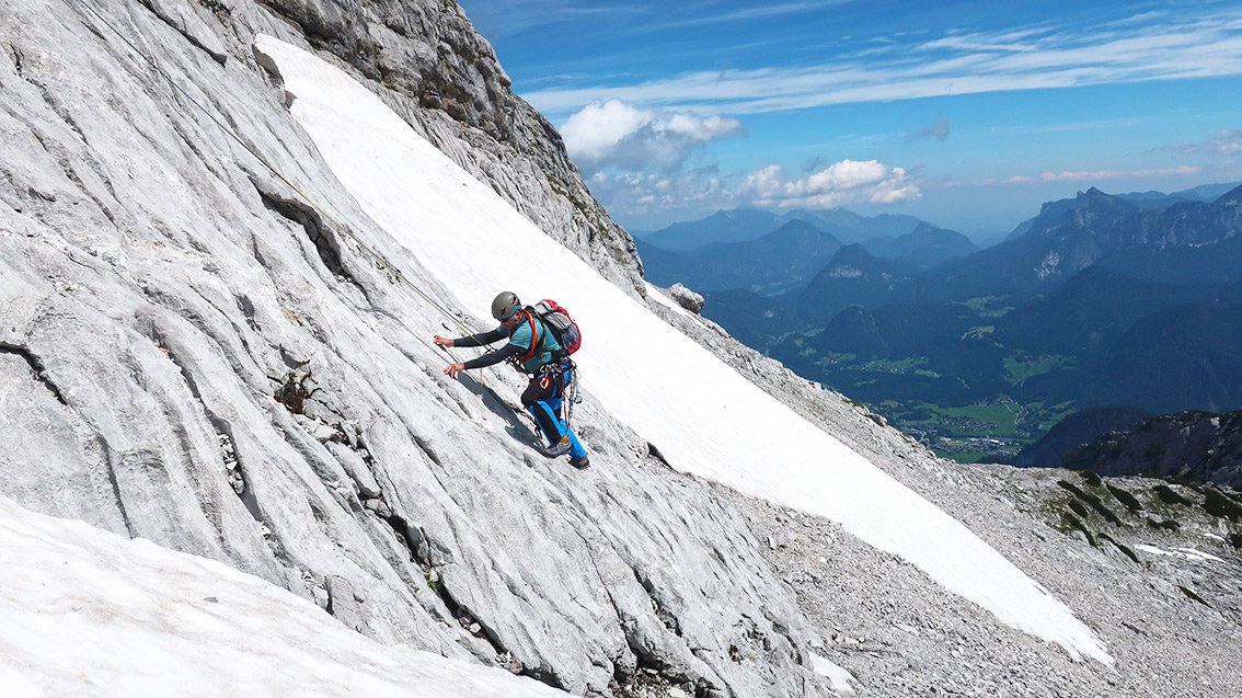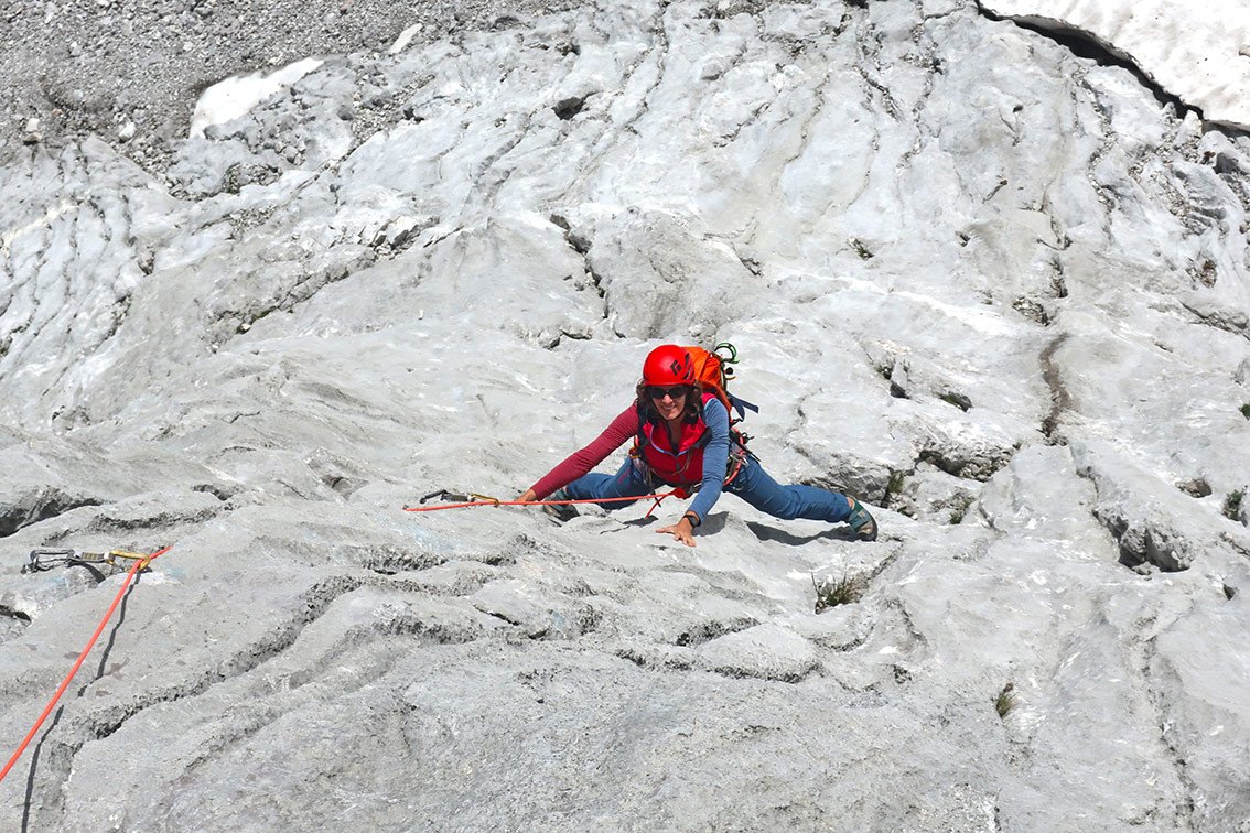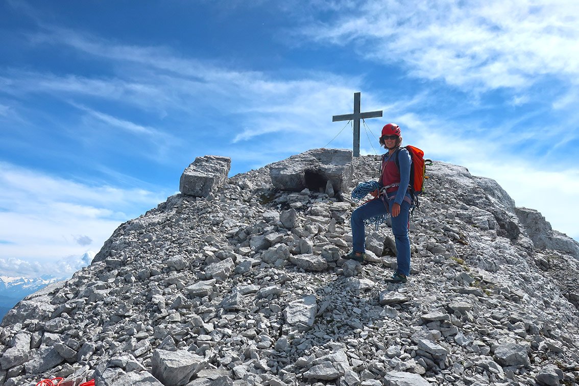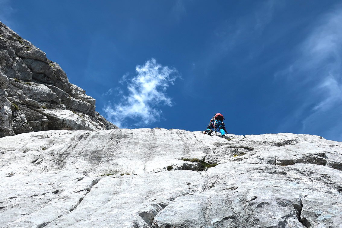 Wegen des brüchigen Felsens lässt man besser den versierteren Kletterer die letzten beiden Seillängen am scharfe Seilende vorsteigen.