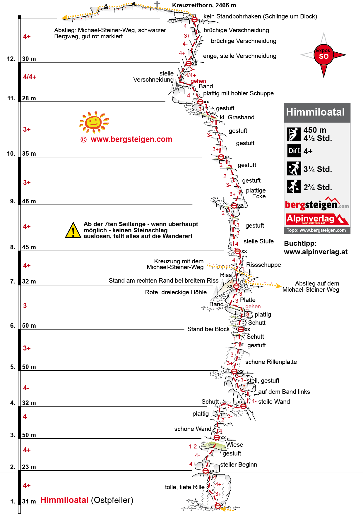 Die Route Himmiloatal (Himmelsleiter) ermöglicht einen kompletten Wanddurchstieg an der Südostseite des Kreuzreifhorns. Die Route sollte eigentlich bis zum Himmel (Gipfel) gehen, der himmlische Genuss für Kletterer und Wanderer (welche den Michael-Steiner-Weg benutzen und den evtl. durch die Kletterer verursachten Steinschlag abbekommen) endet aber bei der Kreuzung mit dem schwarzen Wanderweg. Bis dorthin ist die Route ein guter Kletterweg, die Felsqualität nimmt aber ab der phänomenalen ersten Seillänge nach oben hin ab. Im oberen Teil der Route (ab dem Wanderweg, ehemals auch Ostpfeiler genannt) ist die Absicherung - trotz des sehr brüchigen Gesteins - deutlich schlechter als im ersten Teil. Wer also bei den ersten 7 Seillängen schon Probleme hat, sollte den Gipfelaufstieg besser auf dem markierten, schwarzen Bergweg fortsetzen. Landschaftlich aber ein lohnendes, und wenn man vom Tal zu- und absteigt auch ein langes Kletterabenteuer.