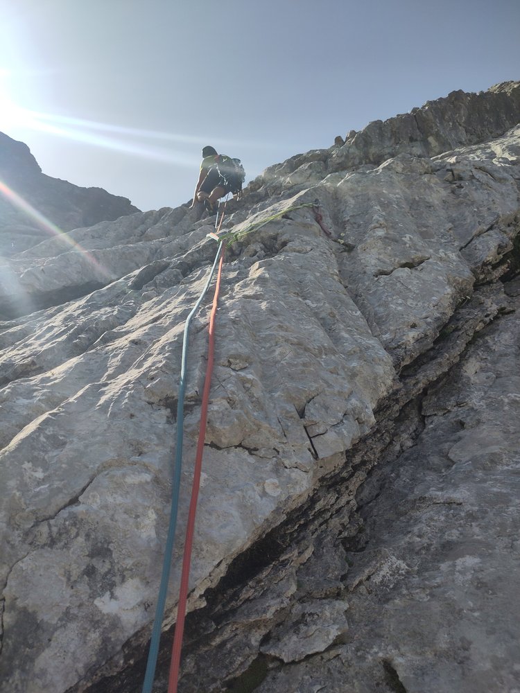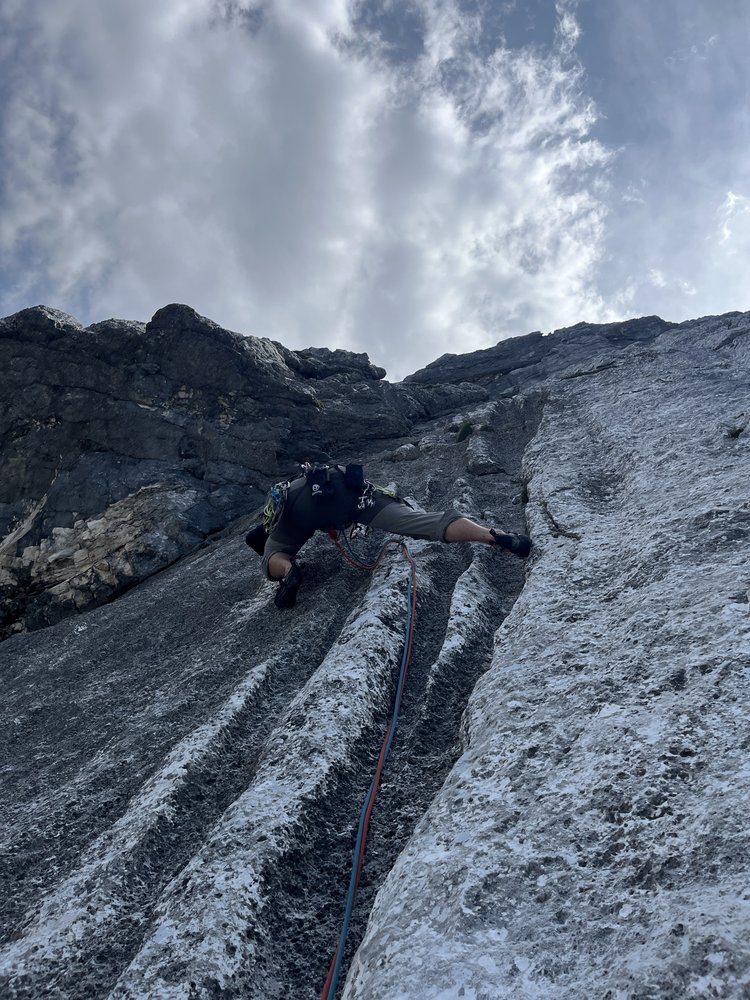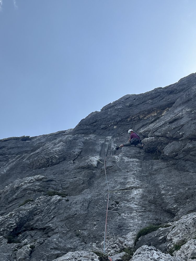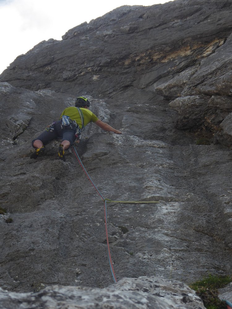 Direkte, zentrale Linie durch den Nordwandsockel, die nahezu durchgehend entlang von fantastischen Wasserrillen variabler Steilheit verläuft. Herrlich fester, wasserzerfressener Wettersteinkalk, der das Emporsteigen zum puren Genuss macht.