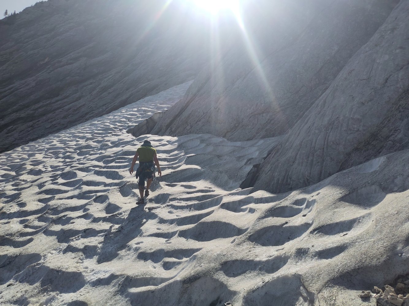 Abseilen über die Route (4 x mehr als 30 m). Vom 2. Stand zum 1. Stand des „Gesellenstücks“ abseilen und von dort 30 m zum Einstieg. Alternativ Ausstieg zum Hirschbichl über den „Weg zur Sonne“ (6), dafür vom letzten Stand 25 m Querung (2) zum letzten Stand des „Gesellenstücks“.