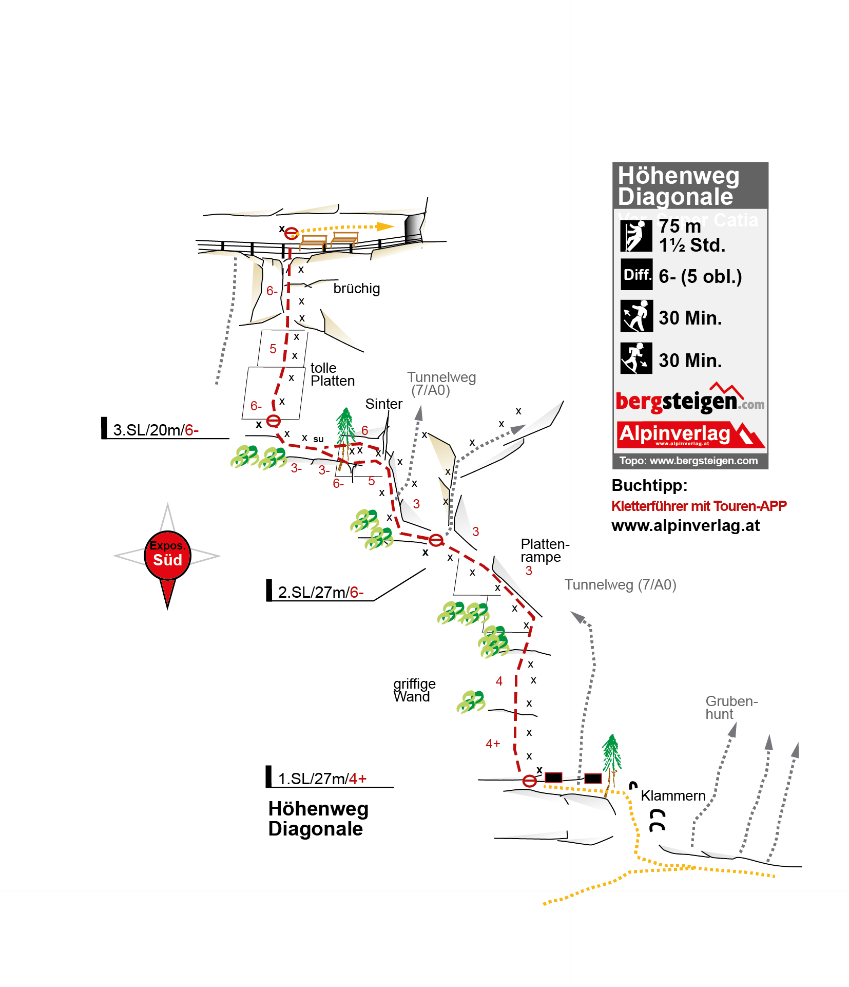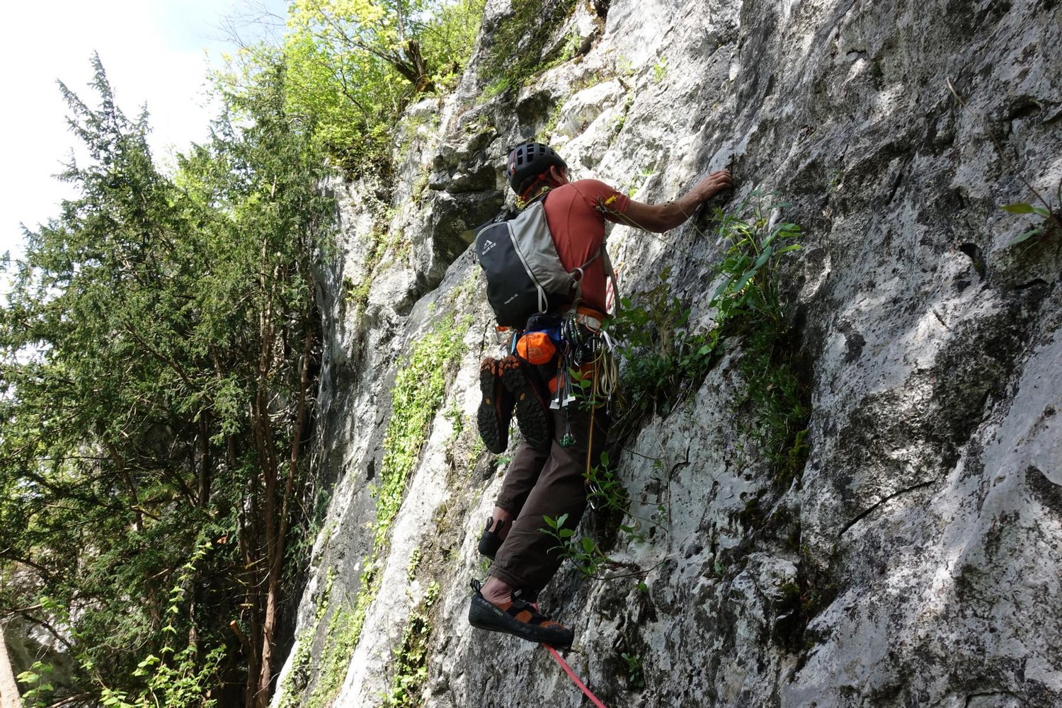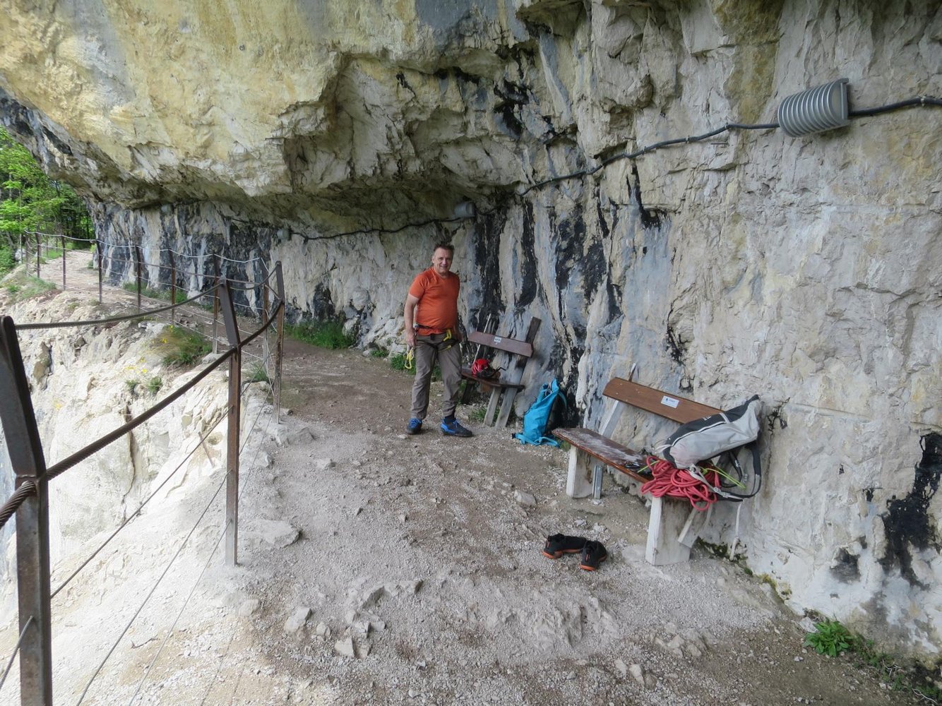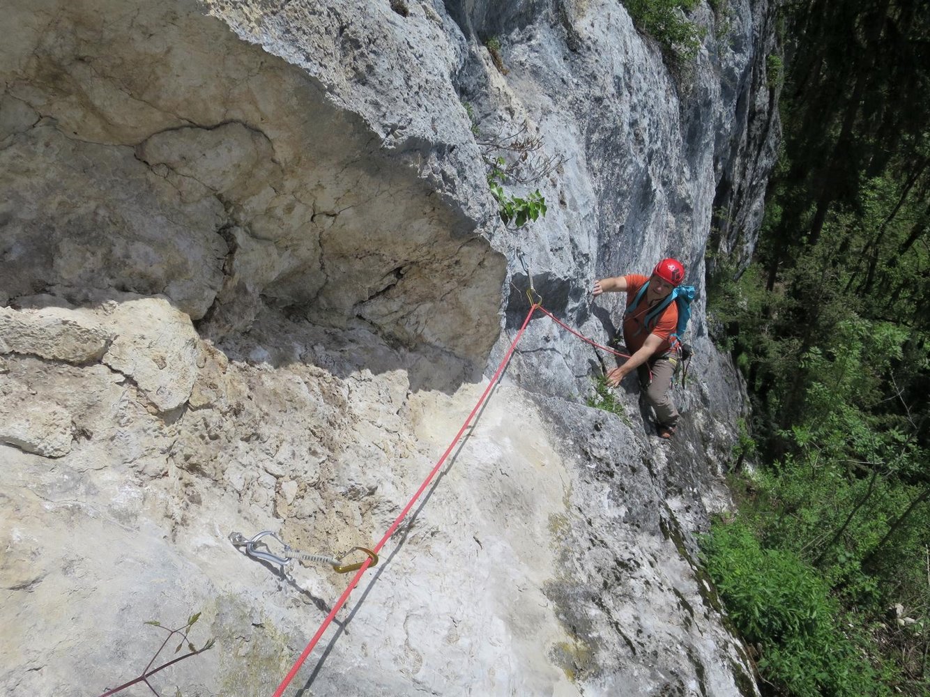 Nette Kurzroute unter dem Höhenweg. Die Route hat drei abwechslungsreiche Seillängen mit Rampen, Sintern und einer schönen Abschlussplatte.