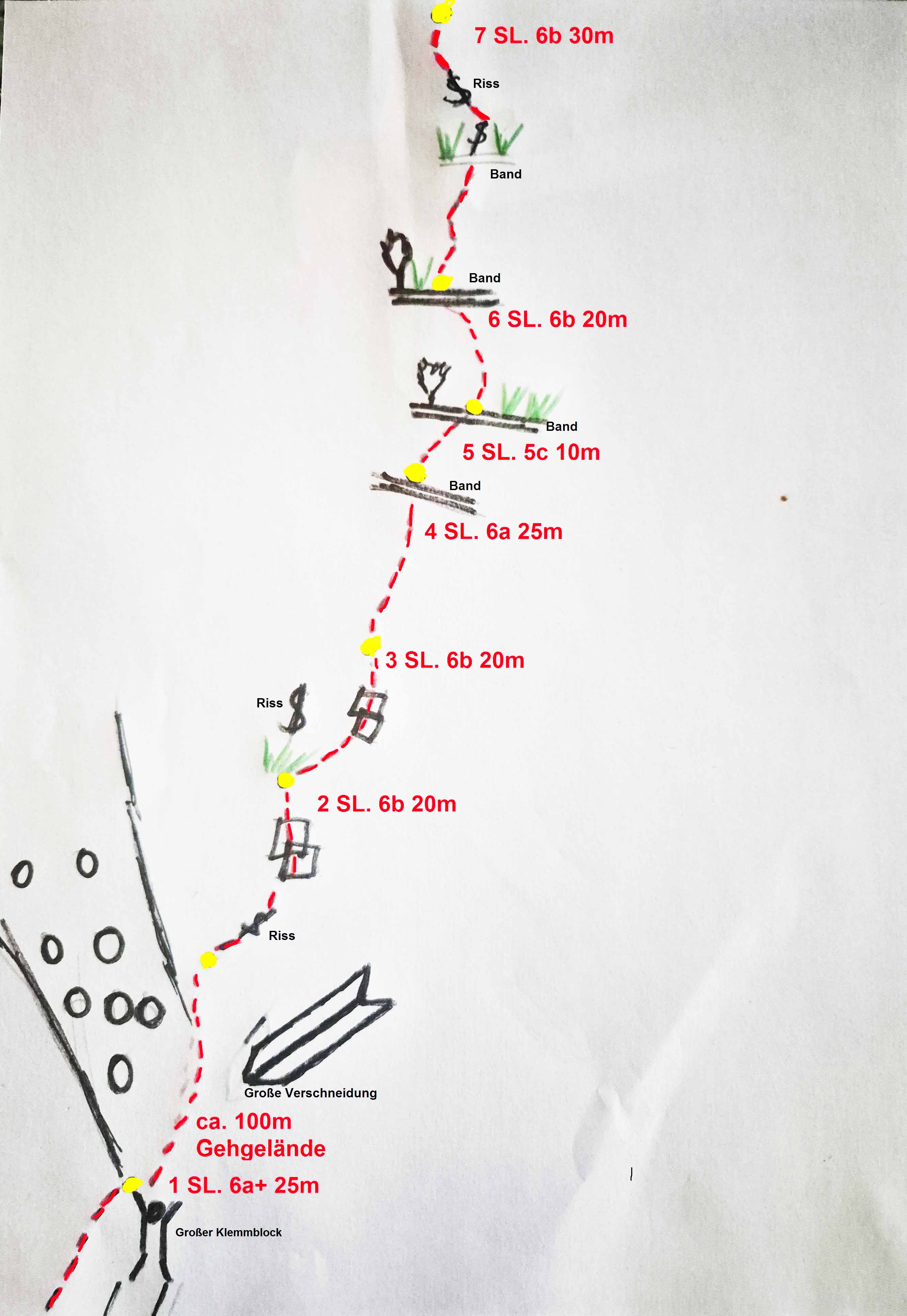 Ausgehend vom Dürrensee über den Pionierweg Richtung Monte Piano ca. 300hm 46.629292, 12.239393 aufsteigen. (45min) Den Wanderweg verlassen und kurz steil eine Rinne hoch und entlang von Pfadspuren durch das Latschenfeld (ausgeschnitten) über den Sattel in einen Graben. Den Graben dann aufwärts folgen bis wenige Meter unterhalb des großen Klemmstein zum Einstieg. Auf der linken Seite der Schlucht, Split mit Schlinge (ca. 10min). Die erste Seillänge ist gemeinsam mit der „Links vor Rechts“, dann ca. 100m(Gehgelände II) hinauf bis zum Einstieg. Beim ersten Bohrhaken befindet sich eine Schlinge.
