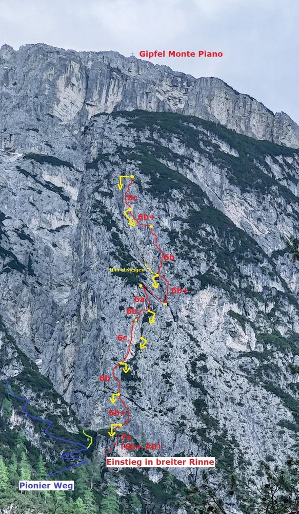 Ausgehend vom Dürrensee über den Pionierweg Richtung Monte Piano ca.350 hm 46.629292, 12.239393 aufsteigen. (45min) Den Wanderweg verlassen und kurz steil eine Rinne hoch und entlang von Pfadspuren durch das Latschenfeld (ausgeschnitten) über einen Sattel zum Einstieg in einer breiten Rinne hinter einem Vorbau. (5min)