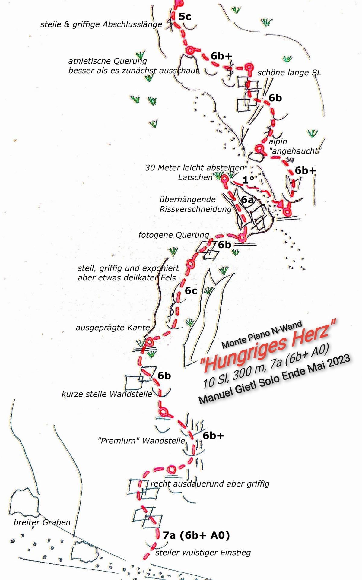 Hunderte Male war man bereits in den weitum bekannten Klettersektoren in der Nähe des Dürrensees. Viele davon bieten einen idealen Blick auf die Nordseite des im Ersten Weltkrieg heftig umkämpften Gipfels des Monte Pianos. Bereits vor einiger Zeit war mir dort ein markanter Pfeiler mit einer recht steilen Wandflucht aufgefallen. Im Laufe dieses Frühlings reifte nun die Idee soweit, dass ich nach einer länger andauernden Schlechtwetterphase im Mai beschlossen hatte, eine Erstbegehung zu probieren. Erstaunenswert war die Tatsache, dass die Wand um vieles trockener und steiler war, als vorher erwartet. Das Vorhaben eine gut gesicherte kreative Linie im Solostil zu erschließen, ließ sich dank großer Motivation und Begeisterung zügig verwirklichen. Die Route bietet überraschender Weise lange, ausdauernde und steile Kletterei im typischen Landrodolomit, der sich streckenweise sogar von seiner besten Seite präsentiert. Das „Hungrige Herz“ könnte sich zur lohnenden Alternative zu den Mehrseillängen-Klassikern in der Rienzwand und Popenawand entwickeln.