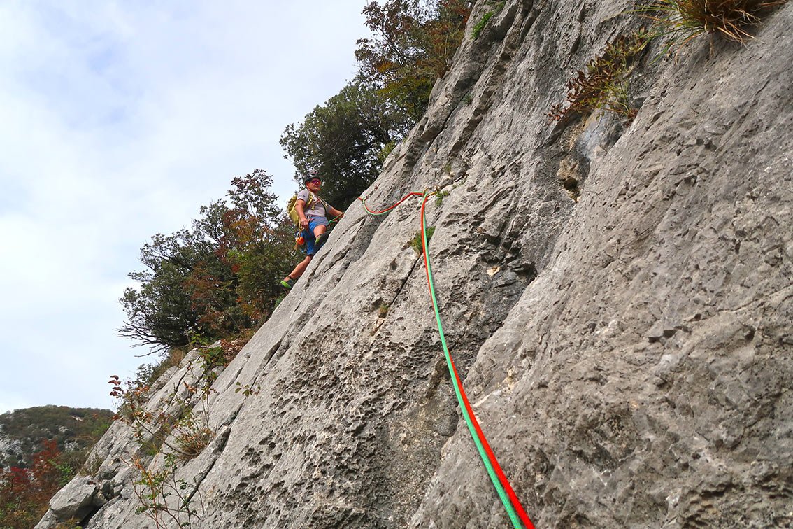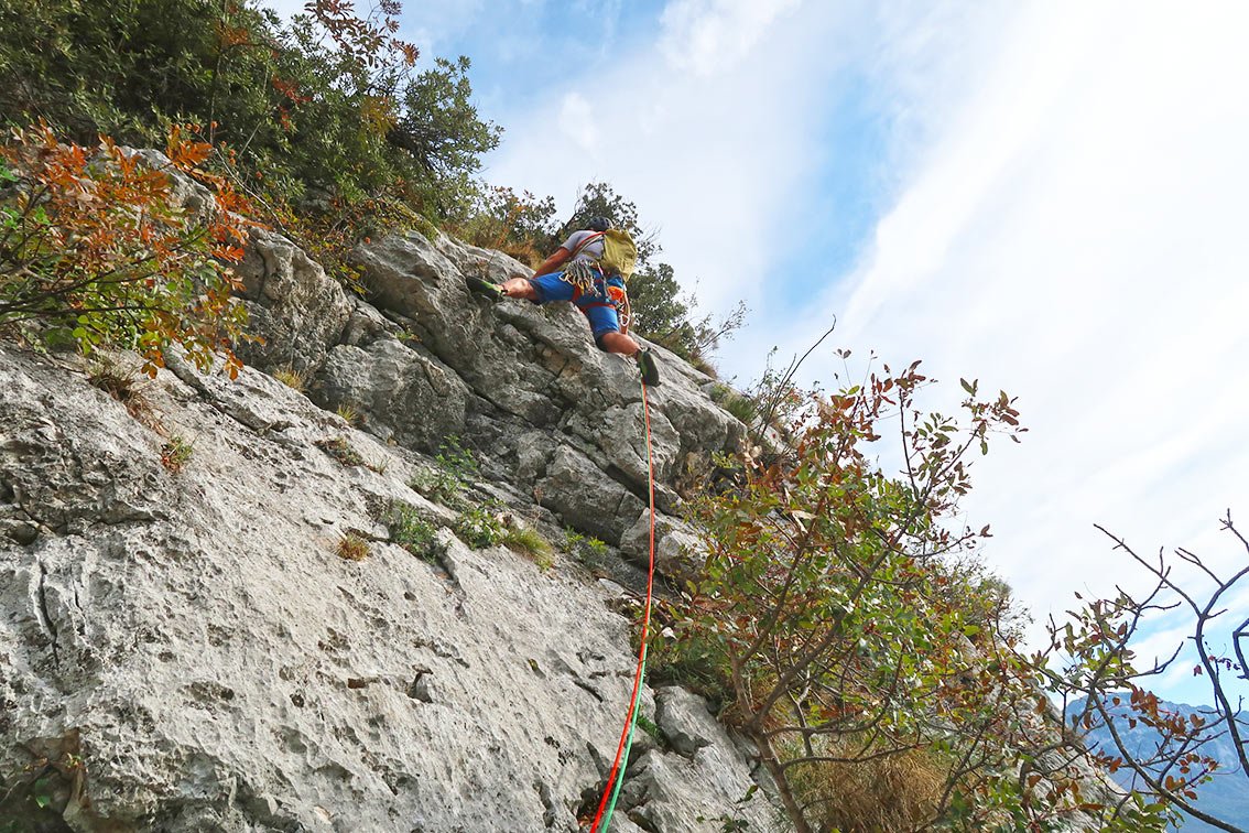 Da die Sektoren oft übereinander liegen (siehe Vorschläge/Topos auf dieser Seite oder unsere Kombination: Caino e Abele, 5 SL, 6-; Zio Genio, 3 SL, 6-; Il Cadetto, 6 SL, 6-; Fausto Susatti Klettersteig, 200 Hm, B), lässt sich ein kurzer Dezembertag locker ohne Zwischenabstieg füllen. So kommen zwar einige SL zusammen, das Ganze wirkt aber nicht so ernst, weil immer wieder waldiges Gehgelände zwischen den Sektoren liegt. Einziges Problem bei einer Vielzahl an Wegspuren zu noch mehr Felsen ist die Orientierung. Oftmals sieht man die nächste Wand vor lauter Bäumen nicht. Aber wenn das geschafft ist findet man dort eine lohnende und oft auch leichtere (weil sehr human bewertet) Alternative zu den Klettereien um Arco und im Sarcatal, allein schon der Tiefblick auf den tief unten liegenden Gardasee ist den Ausflug wert. Die Wände dort sind noch etwas stärker gebändert als beispielsweise San Paolo, was bedeutet, dass man auch während einer Tour immer ein, zwei SL klettert und dann wieder durch den Wald spaziert.