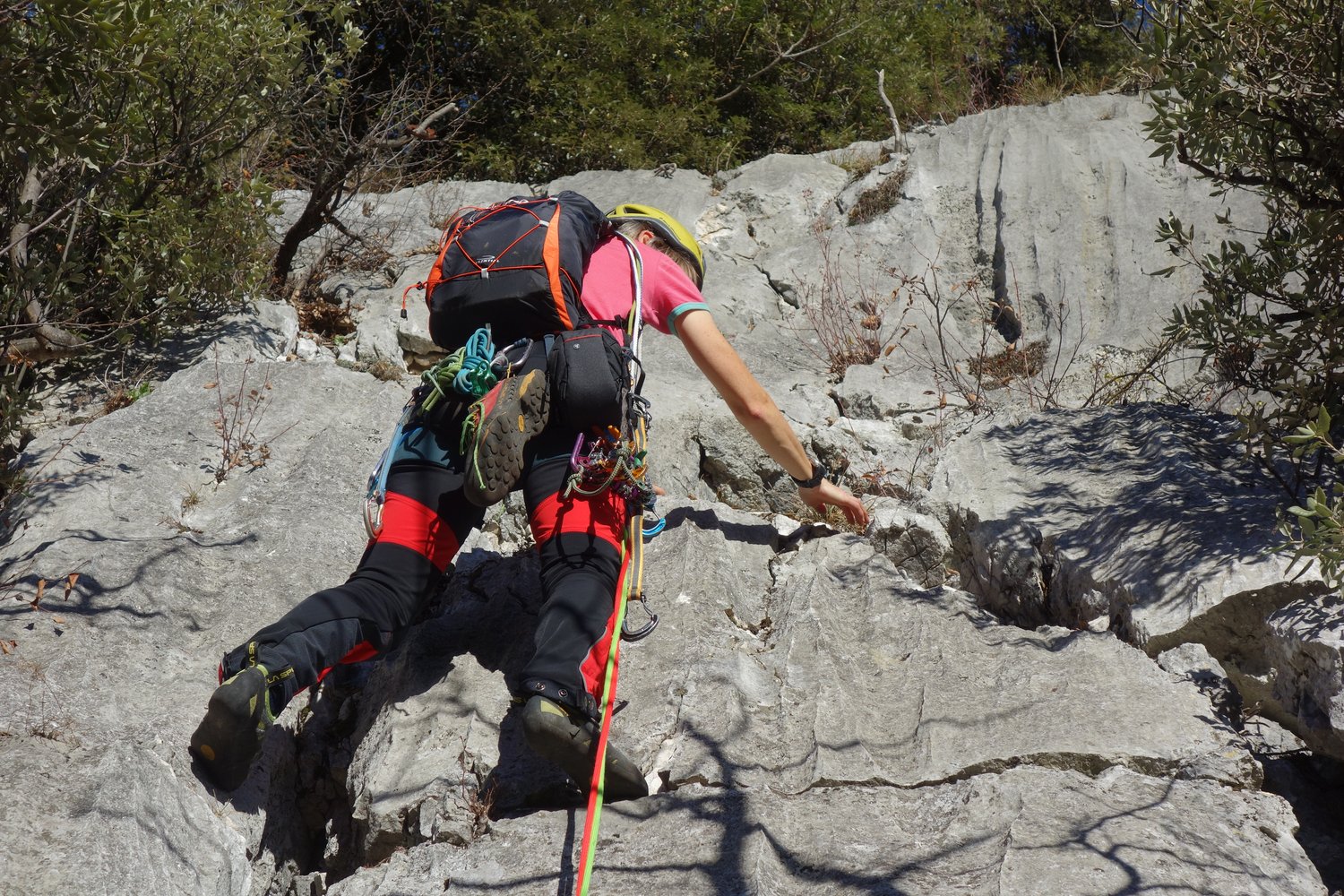 4. SL: 35m, vom Band schwierig zum hoch gesetzten NH in der nächsten Platte (6-) und über herrliche Platten auf Band. Links ansteigend (Gehgelände) zum Stand an BH (Nachbarroute „Il Sogno di Carlo“) oder an gebohrter SU. 6-, 5+ und 1, 4 NH, 1 SU
