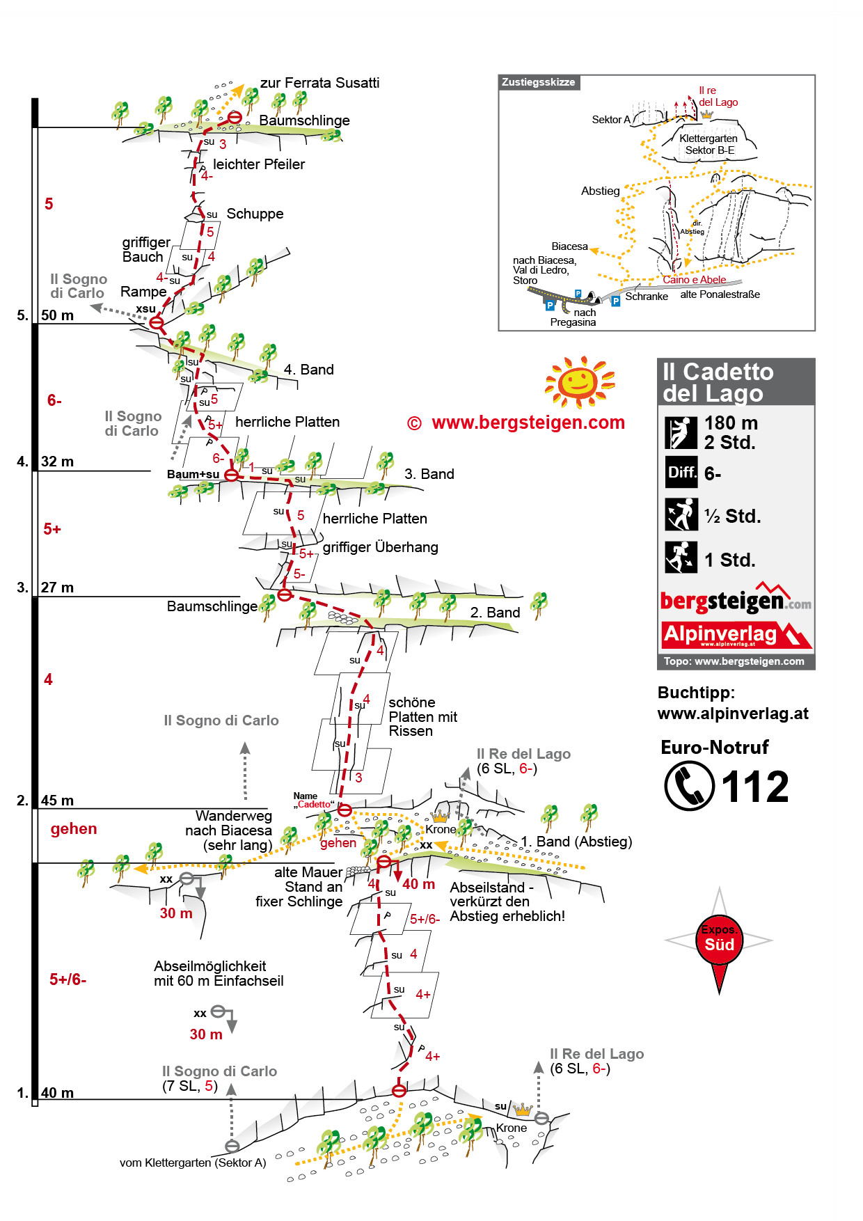 Alternativer, schnellerer Fußabstieg zur alten Ponalestraße (ohne abseilen): Man steigt bei der Ferrata Susatti zuerst steil in Richtung Riva ab, geht dann aber (auf ca. 390 m) auf dem Querweg zurück in Richtung Biacesa. Der Querweg führt unter den mittleren Klettergarten, von dort steigt man zur alten Ponalestraße ab.
