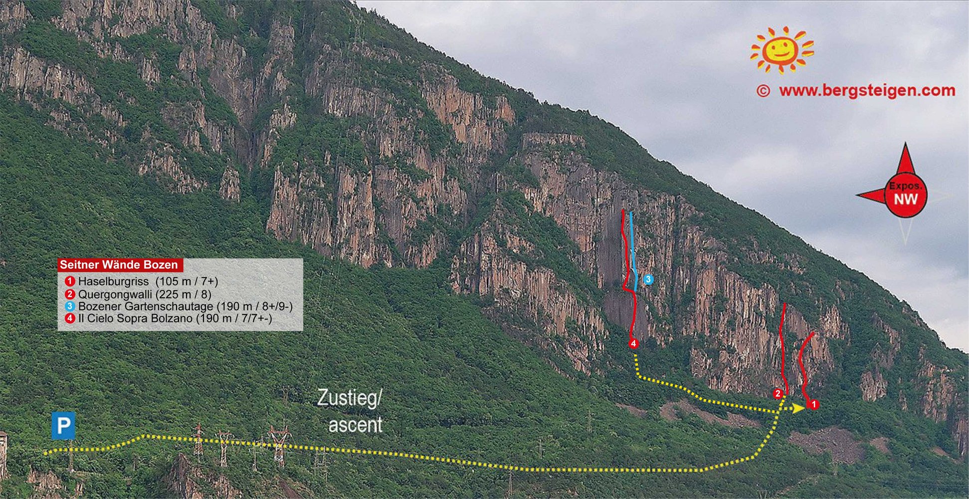 Von der Haselburg auf dem Wanderweg (Leiferer-Höhenweg) Nr. 3 in südlicher Richtung gehen. Zuerst auf der Asphaltstraße, in einer Kurve dann weiter auf dem Weg Nr. 3 bis man unter die Seitner Wände kommt. Bei einem Steinmann verlässt man den Weg und steigt zum Klettergarten auf. Dort links der Wand entlang bis zum Ende des Klettergartens und dem steilen Weg mit Fixseil nach oben folgen, bis man den Einstieg der Route Il Cielo Sopra Bolzano erreicht (gleich links neben der Sabine, die Route Sabine ist groß angeschrieben).