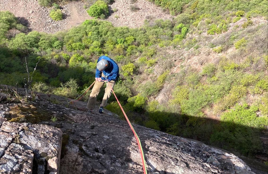 Über die Route abseilen, wie im Topo eingezeichnet. Auf dem Band wechselt man mithilfe des fixen Stahlseils zum unteren Standplatz. Unten dann auf dem schon bekannten Zustiegsweg zurück zum Parkplatz bei der Haselburg.