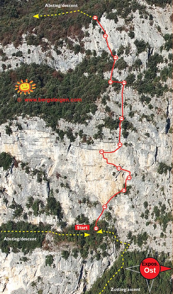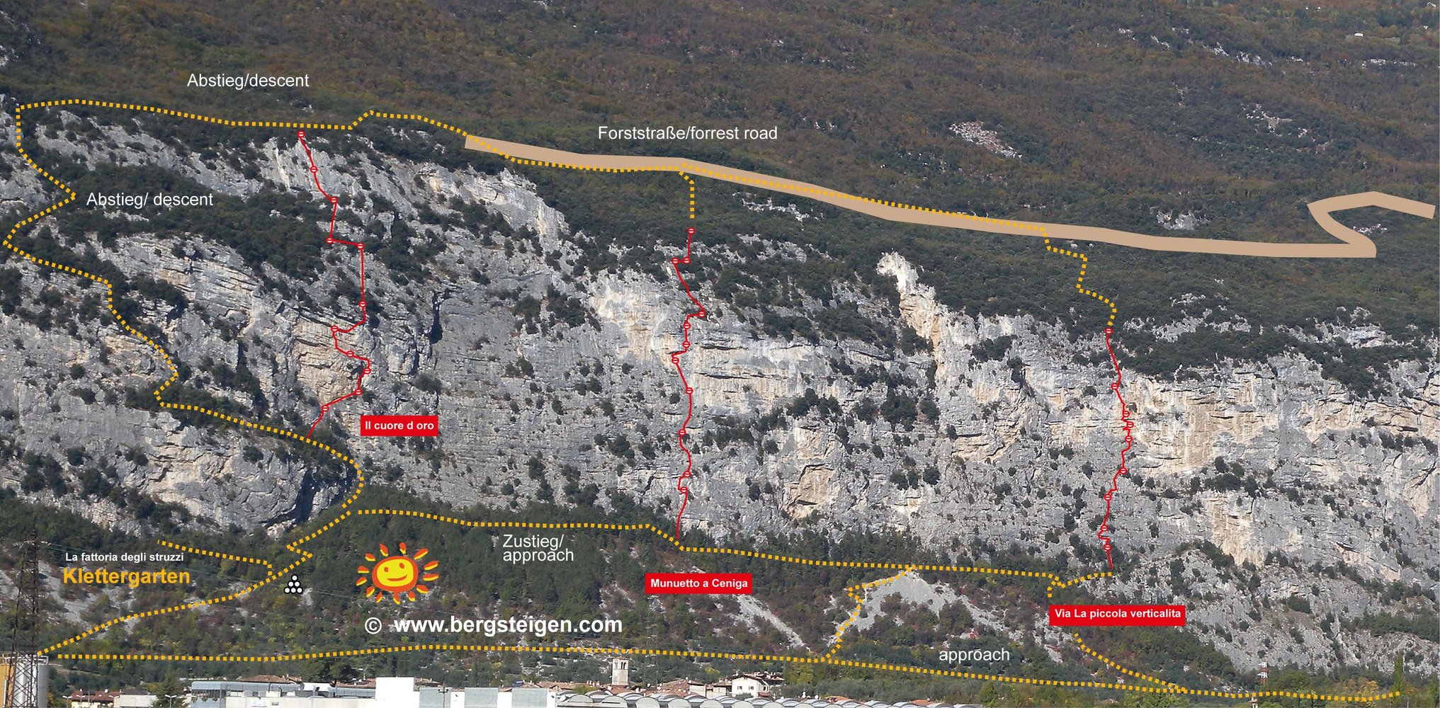 Vom Parkplatz auf der Straße Richtung Bauernhof „Maso Lizzone“ und davor links abzweigen (Wegweiser Wanderweg Nr. 428 Sentiero degli Scaloni). Dem markierten Weg bis unter die Wand folgen und auf dem leichten Steig (Sentiero degli Scaloni) auf das erste große Querband aufsteigen. Der Einstieg ist genau am Weg (gelbe Sonne mit dem Namen).