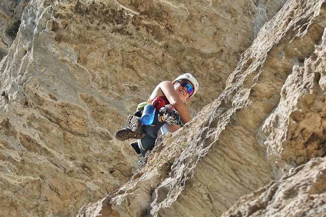 Die Route ist alpin, mit wenigen Bohrhaken, Normalhaken und Sanduhren abgesichert!