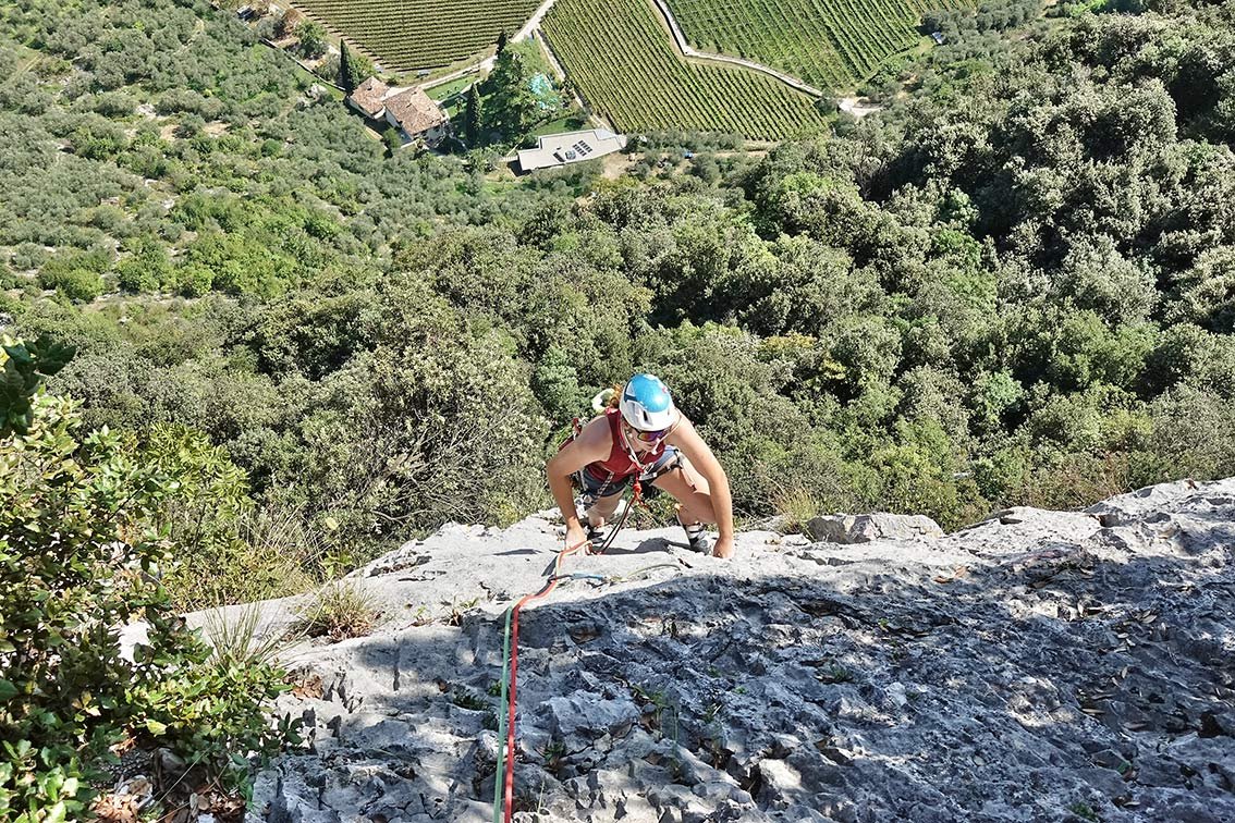 Wer genug Kraft hat, kann sich in der Oksana (7, sehr gut mit Bohrhaken gesichert) warm klettern, vom Ausstieg der Oksana steig man rechts zum Beginn der Il cuore d’oro ab.