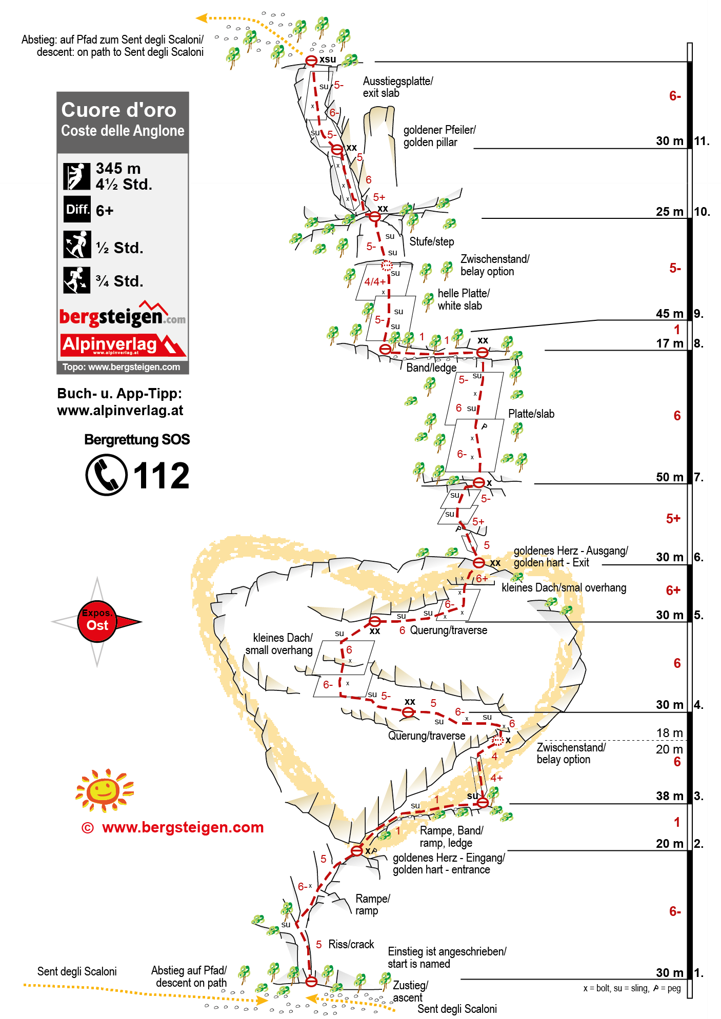 Die Il Curore d Oro ist eine fantastische Alpin-Route mitten durch eine überhängende Wandzone oberhalb des Sentiero degli Scaloni. An Dellen, Platten und kleinen Überhängen schwindelt man sich im Zickzack durch das Herz in der überhängenden Wand. Der Fels ist bis auf wenige Ausnahmen sehr gut. Die Route beginnt mit einer roten Rampe, dann das Zickzack durch das Herz, es folgen graue, etwas mit Botanik bewachsene Platten und am Ende klettert man einen schönen "goldenen" Pfeiler zum Ausstieg. Die Tour durch das "goldene Herz" ist eine der Arco-Touren, die man als Alpin-Kletter-Touren-Liebhaber gemacht haben sollte.