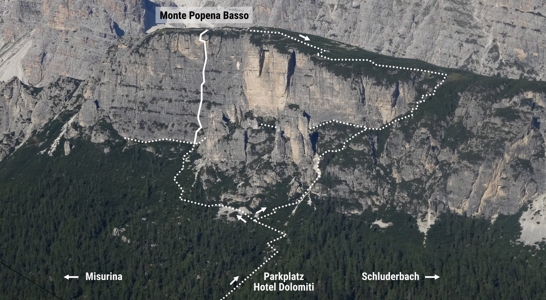 Vorm Ausstieg der Wand entlang nach Norden und über einen Steig zurück zum Parkplatz. Siehe Übersichtsbild.