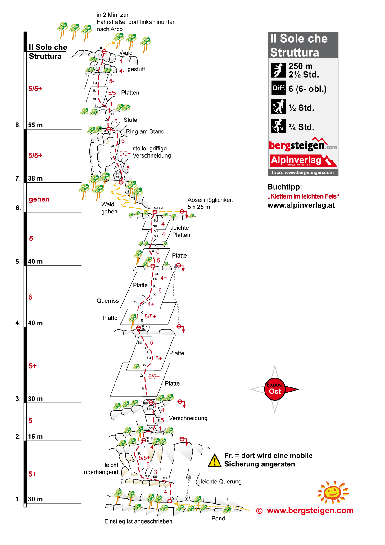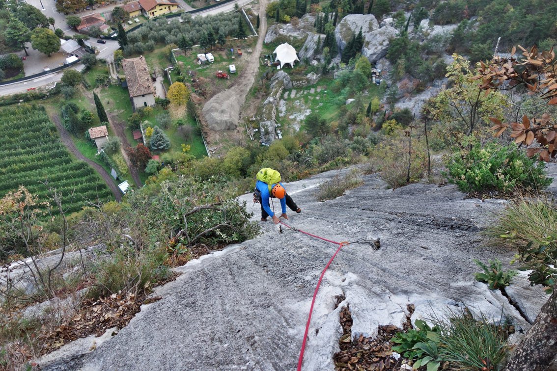 Zur Pizzeria und die Straße kurz zurück in Richtung Arco, ein Steiglein führt hinauf zum Klettergarten (mit einem markanten Doppelrissdach). Noch unterhalb der Felsen auf Pfadspuren nach Links - man quert länger im Gebüsch und kommt am Ende auf ein Band. Auf diesem bis zum Einstieg (Ringhaken und Aufschrift).