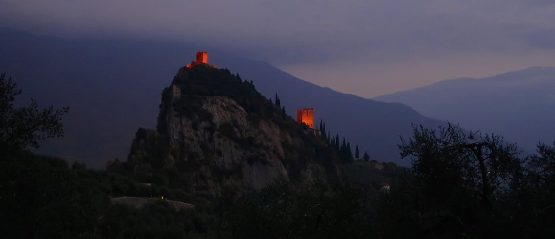 Vom Ausstieg gerade weiter in den Wald und zur Fahrstraße. Auf dieser nach links hinunter nach Laghel und von dort weiter nach Arco. In den Gassen von Arco hält man sich immer links. Am Ende auf der Straße zurück zum Parkplatz beim Gasthof Laterna (Pizzeria).