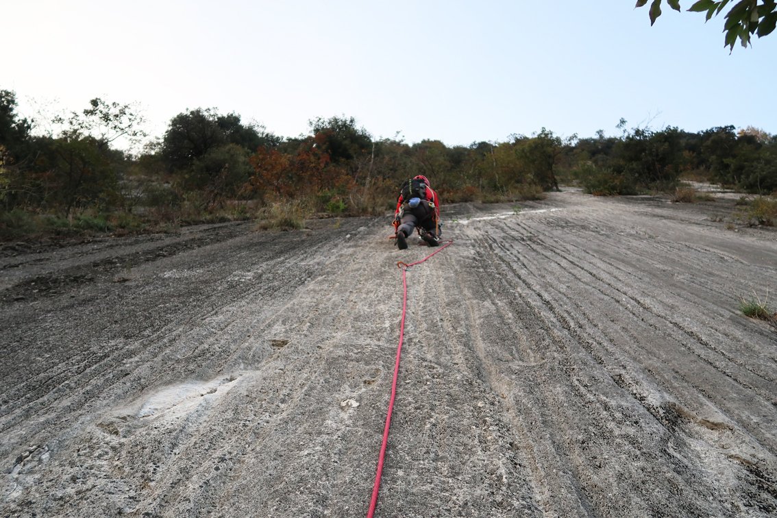 Die Tour ist nicht wirklich gut abgesichert - an den schweren Stellen in den Platten gibt es wenige Bohrhaken (tlw. auch recht eng ?!). Sonst gibt es als Absicherung aber nur Sanduhren und einige, teilweise recht schlecht platzierte Normalhaken. Am Ein- und Ausstieg steckt z.B. ein solider Bohrhaken, diese Bohrhaken wären in der Route (statt dem Holzkeil-Normalhaken in der ersten Seillänge oder dem weit raus stehenden Normalhaken im ersten Teil der 3ten Seillänge) unserer Meinung nach sinnvoller platziert gewesen. Man sollte einen erfahrenen Vorsteiger haben, der den 6ten Grad gut klettert und auch mit mobilen Sicherungsmitteln etwas umgehen kann.