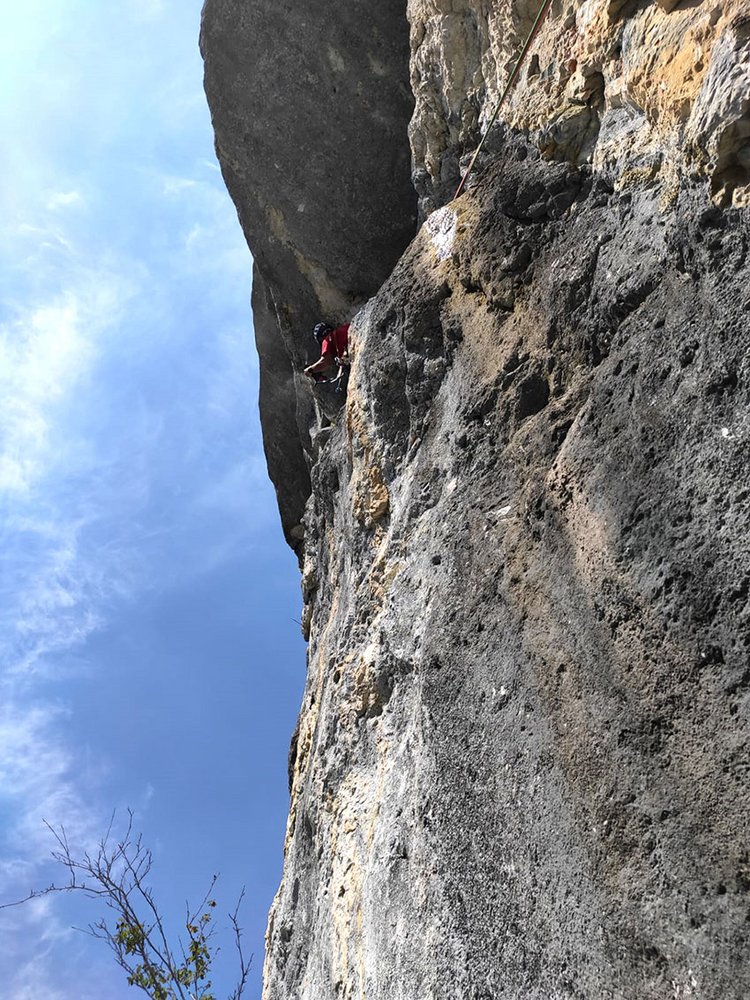 Siehe Topo: 1. Seillänge an phänomenalen, wasserzerfressenen Fels auf einen Absatz unter einer schönen Platte. 2. Seillänge ist kompakte Plattenkletterei, 3. Seillänge ist eine plattige Rampe, 4. Seillänge an verdonesquem Fels, 5. Seillänge ein etwas alpiner Riss, 6. Seillänge ein kompakter Spalt und Rasenrampe.