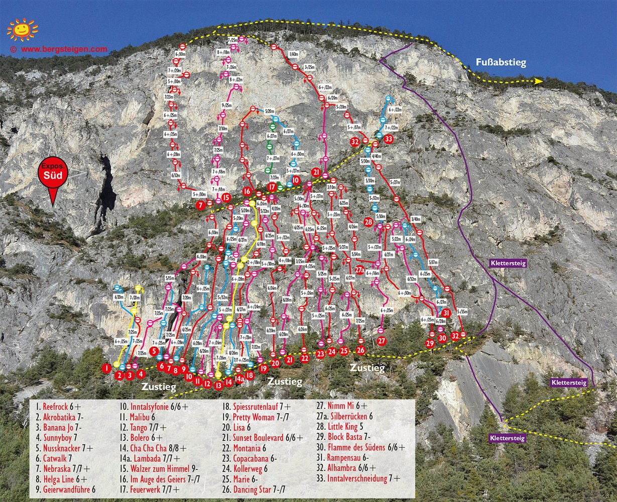 Auf der A12 bis zur Abfahrt Mötz und weiter in den Ort Haiming. Im Ort der Beschilderung „Rafting-Center“ folgen. Nach der Innbrücke sofort rechts und am Rafting-Center vorbei zum Parkplatz (große Klettersteigtafel). Öffis: Mit der Bahn nach Haiming und mit dem Bus zur Innbrücke.