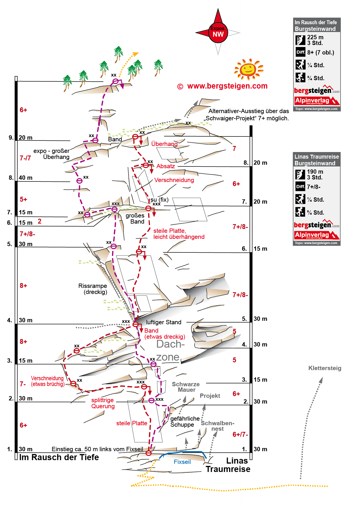 Der "Raus der Tiefe" ist ein Ausdauerhammer an der Burgsteinwand. Die Kletterei ist anhaltend schwer, die vorletzte Seillänge ist das Prunkstück der Tour - mega imposante, steile Kletterei an Felsschuppen.