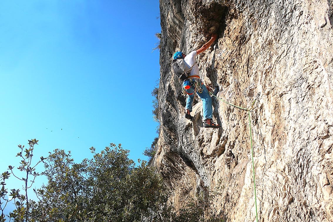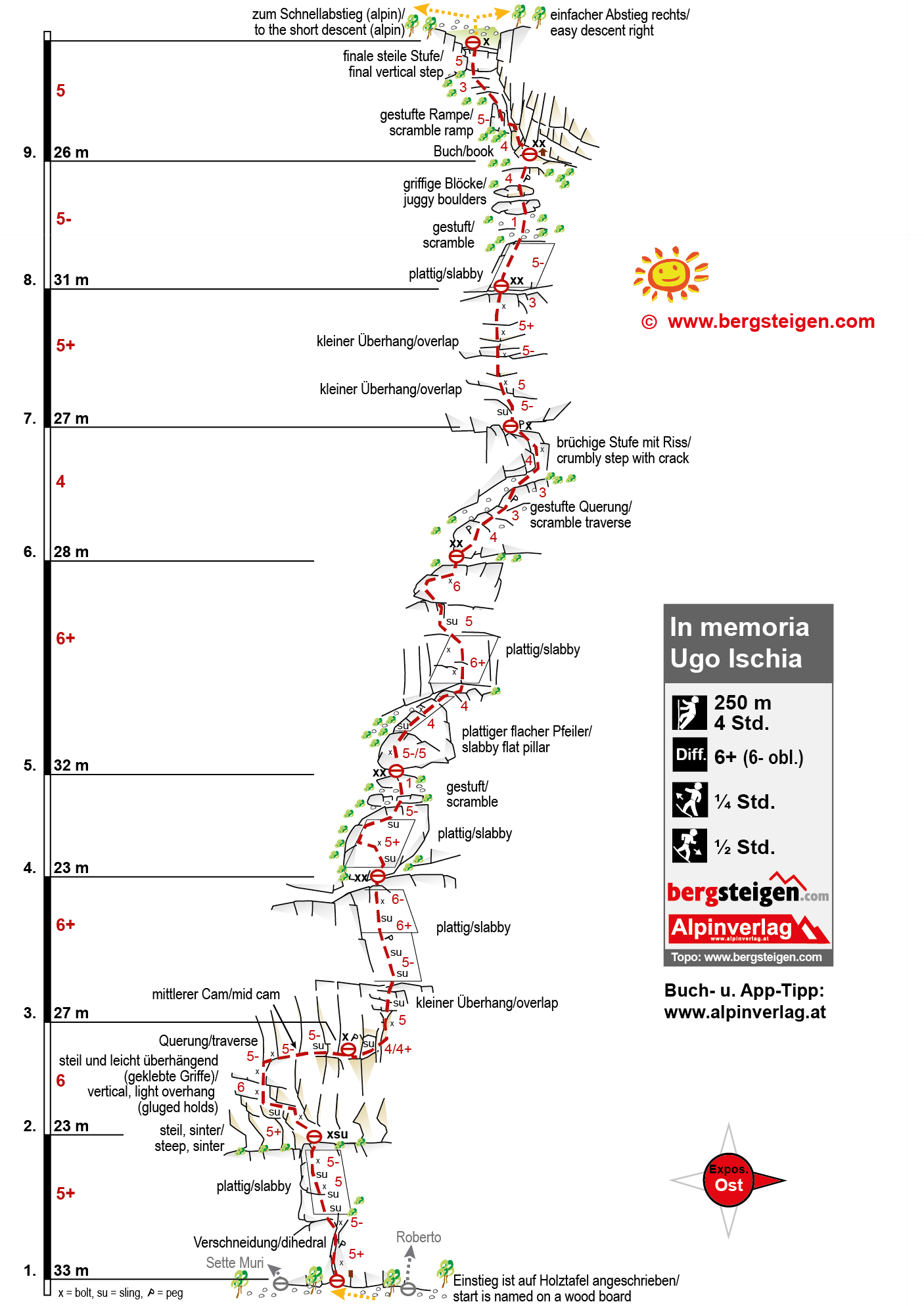 Der Anstieg In memoria di Ugo Ischia ist eine wirklich gut gebaute Route im zentralen Teil der Parete San Paolo. Unten schlängelt sich die Route geschickt zwischen den Überhängen durch, im Mittelteil muss die plattige Schlüsselstelle, an der nur ein Normalhaken steckt, gemeistert werden. Im oberen Teil wird man mit schöner, nicht allzu schwieriger Kletterei bis zum Ausstieg belohnt. Unten, an den Überhängen, wurden Steingriffe an den Fels geklebt - auch dort wo gar keine Griffe waren - so kann man diese Stelle auch als 6er-Kletterer ohne Haken Benützung bewältigen. Der Anstieg ist trotz des kleinen Ethik-Problems sehr zu empfehlen und auch noch nicht ganz so abgeklettert wie andere, ähnlich schwierige Routen an der San Paolo Felswand.