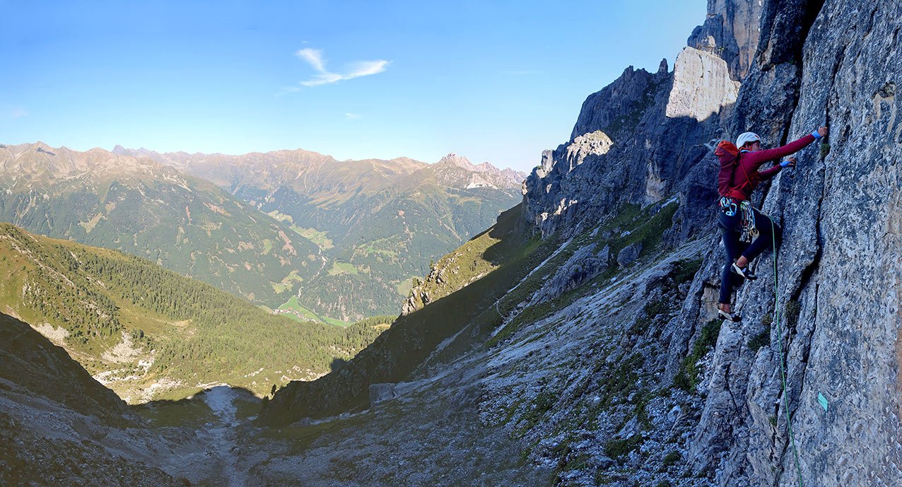 2 x 50 m Doppelseil, 9 Expressschlingen und ein paar Bandschlingen. Evtl. ein paar mittlere Cam, die können aber nur selten gut einsetzt werden.