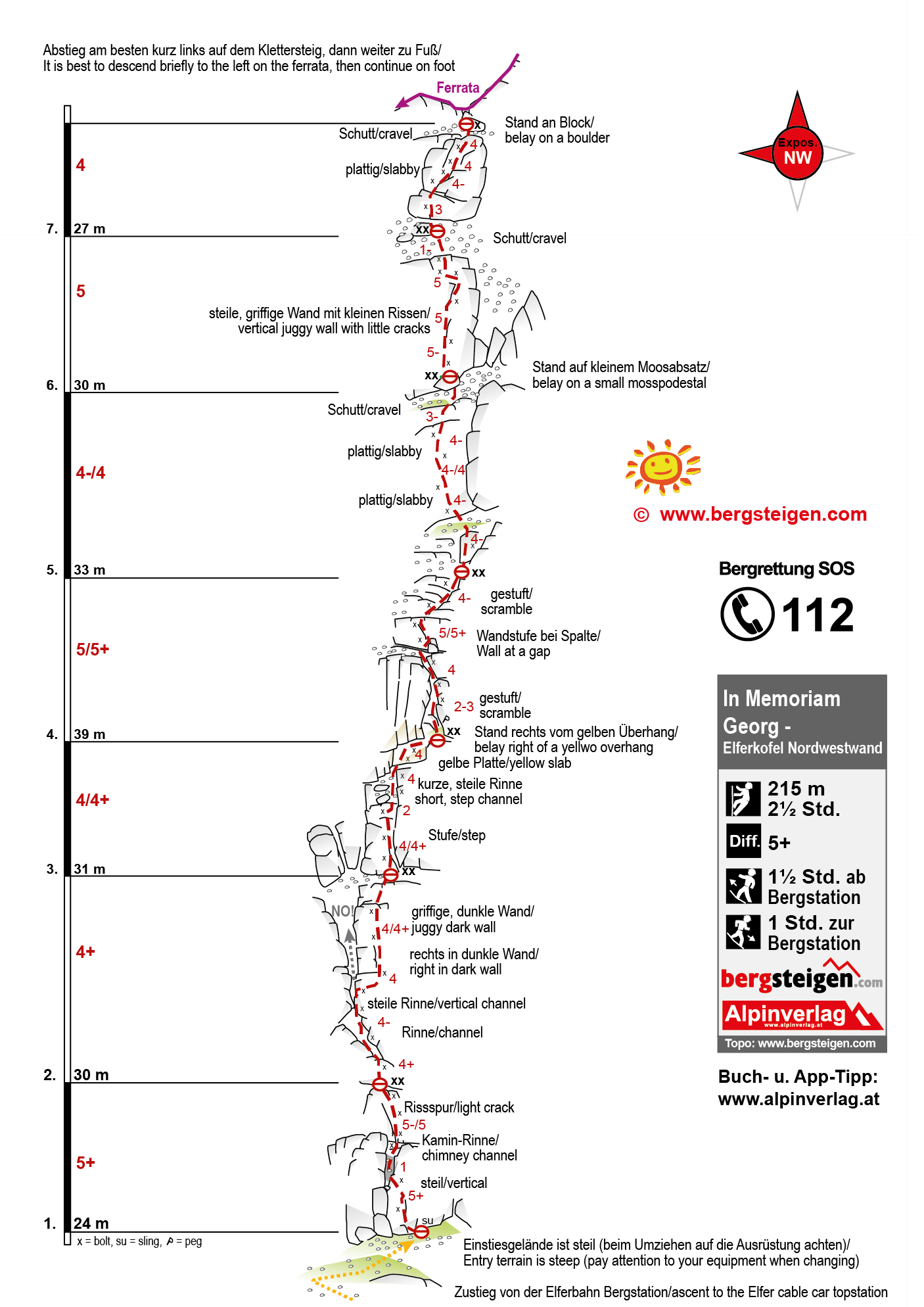Ein kleines Nordwandabenteuer - ungefähr so könnte man die Route "In Memoriam Georg" an der Elferkofel Nordwestwand beschreiben. Schon beim meist noch kühlen Zustieg, aber spätestens am schattigen Einstieg ist man in der Nordwandwelt angekommen. Die Route ist alpin angehaucht, zwischen den Bohrhaken muss man im einfachen Gelände etwas weiter klettern, das ein oder andere Schuttfeld und auch Schrofengelände müssen überwunden werden. Die Route wurde aber ausreichend mit Bohrhaken bestückt, so macht das Klettern durchwegs Spaß. An heißen Sommertagen ist die Route für schon etwas versiertere Mehrseillängenkletterer eine Empfehlung und ein landschaftlicher Hochgenuss.