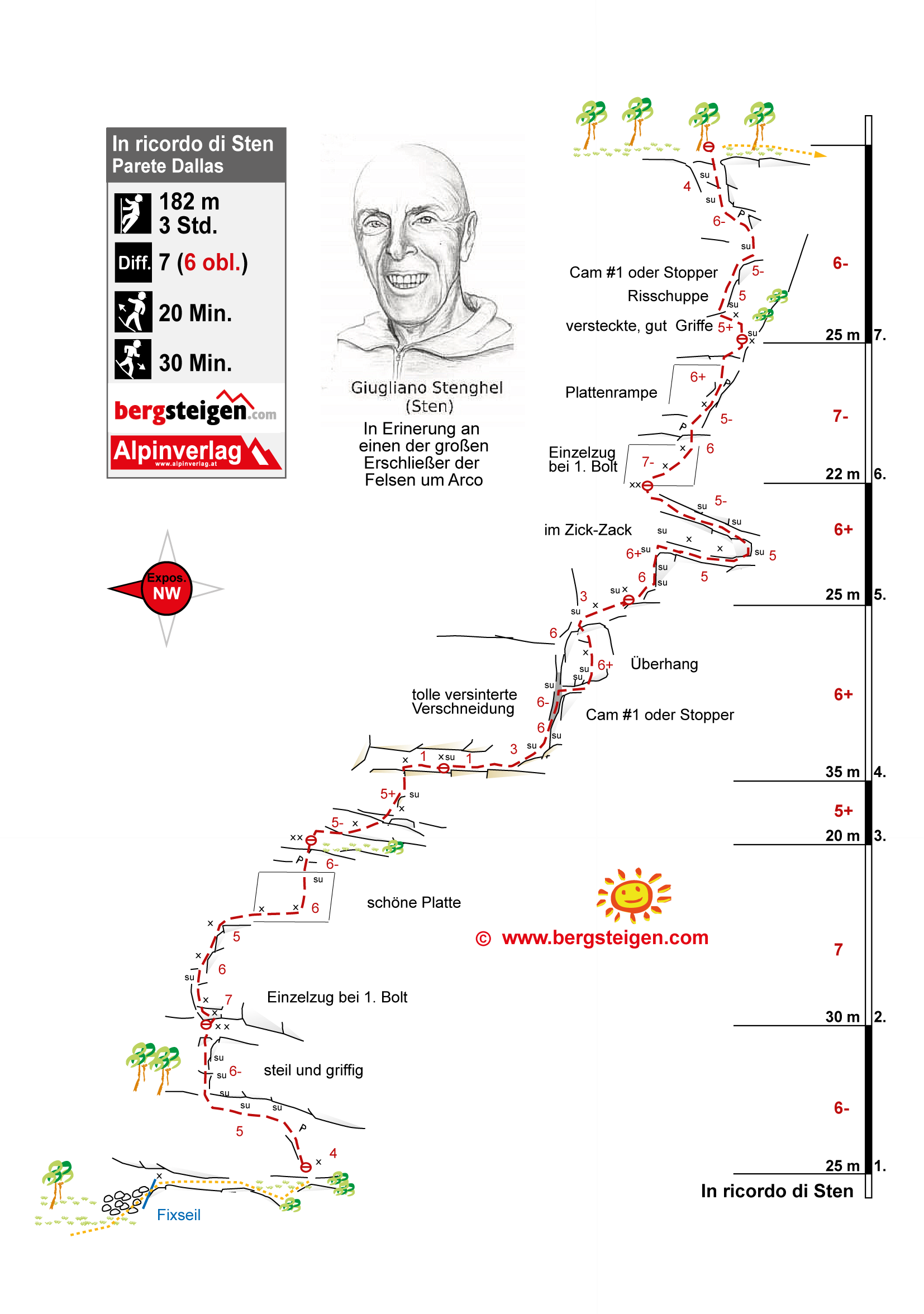 Giuliano Stenghel war einer der Haupterschließer der Felsen um Arco. Kurz nach seinem Tod hat ihm Florian Kluckner - ebenfalls einer der großen Erschließer im Sarcatal - an der Parete Dallas diese Tour gewidmet. Mit dem gleichen magischen Spürsinn von Sten suchte Florian Kluckner einen Weg durch die steilsten Überhänge der Wand. Die Kletterei ist sehr abwechslungsreich und anhaltend schwierig bis zum Schluss. Die Absicherung ist gut, zwei Stellen können mit Cams entschärft werden. Der Fels ist sehr gut und die Tour ist auch perfekt geputzt und empfiehlt sich wegen der nordwestlichen Ausrichtung vor allem für heiße Tage.