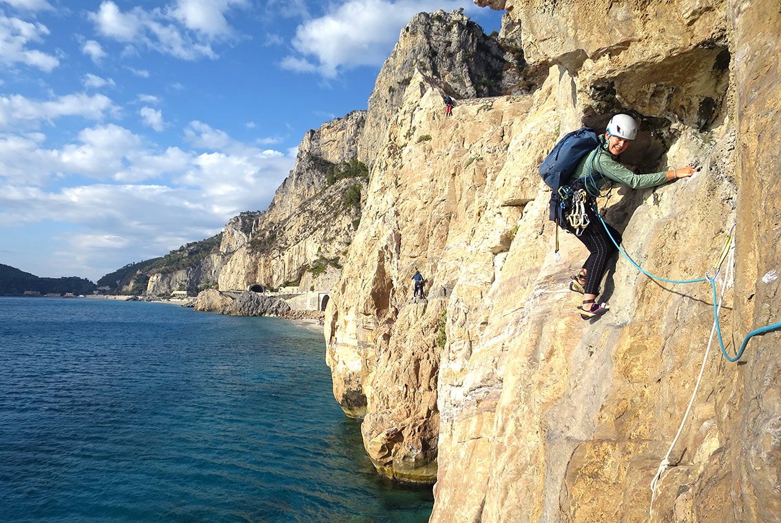 Von Finale Ligure auf der Küstenstraße Richtung Genua. Durch den nächsten Ort Varigotti, am Ortsende ist ein Tunnel. Es folgt ein weiterer Tunnel und danach kommt auf der linken Staßenseite eine Parkbucht. (nicht offiziell). Mann kann auch bereits vor dem letzten Tunnel an der linken Staßenseite parken und in 15 Min. zum Abseilpunkt gehen.