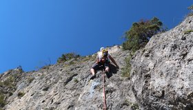 Der Fels ist nicht immer fest, einige brüchige Passagen. Die Absicherung ist aber wirklich sehr gut, deshalb stört das etwas weniger als sonst.