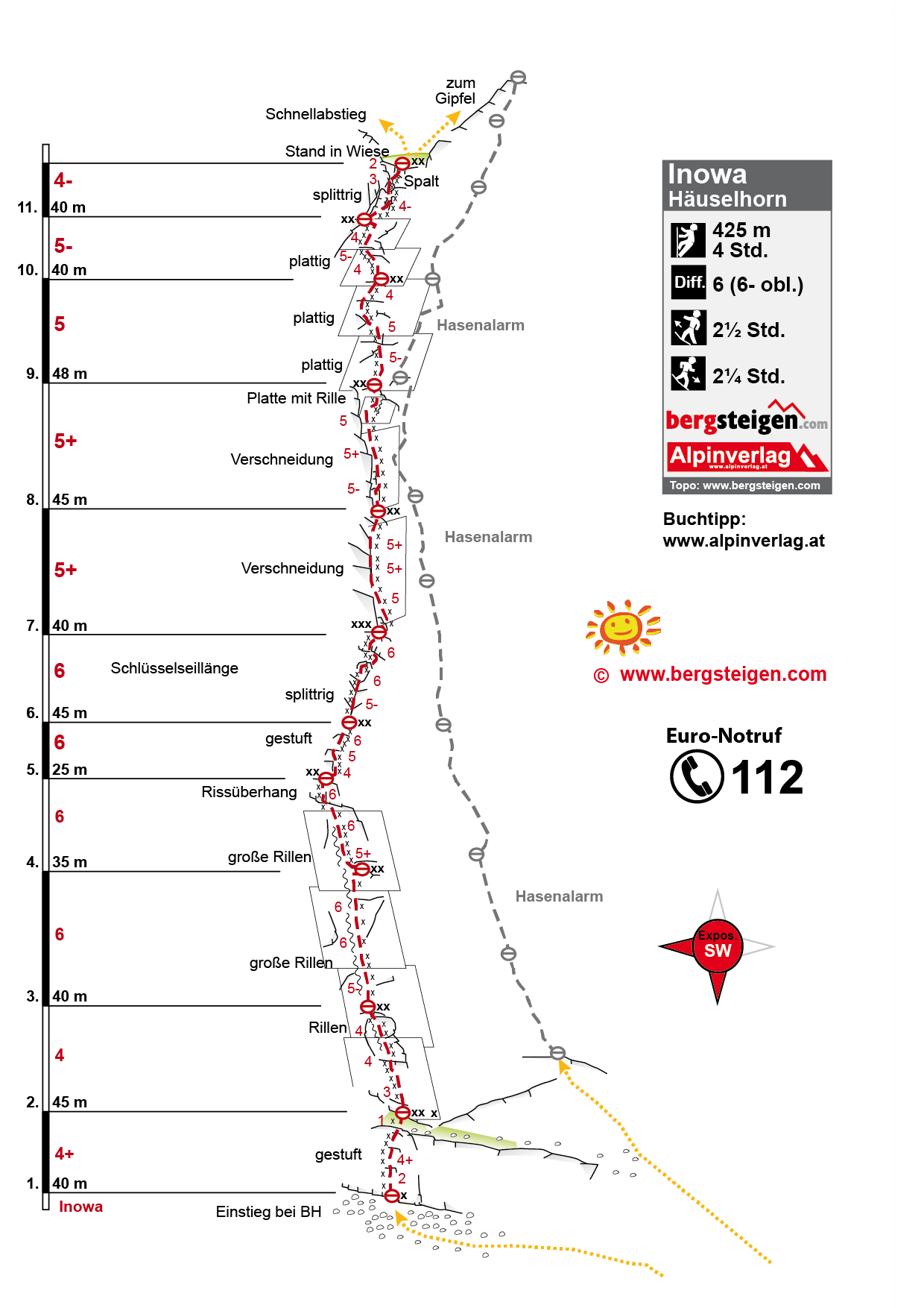 Die Inowa ist eine neue Genussroute links der bekannten "Hasenalarm" am Großen Häuselhorn. In elf, recht langen Seillängen zieht die Route über meist vom Wasser zerfressene Felspartien hinauf und endet in einer kleinen Scharte etwas unterhalb des Hasenalarm-Ausstieges. Der Anstieg ist mit Bohrhaken recht gut abgesichert, man folgt einfach den in benutzerfreundlichen Abstände gesetzten Bohrhaken bis zum Ausstieg - im Notfall könnte man auch über die Route abseilen.