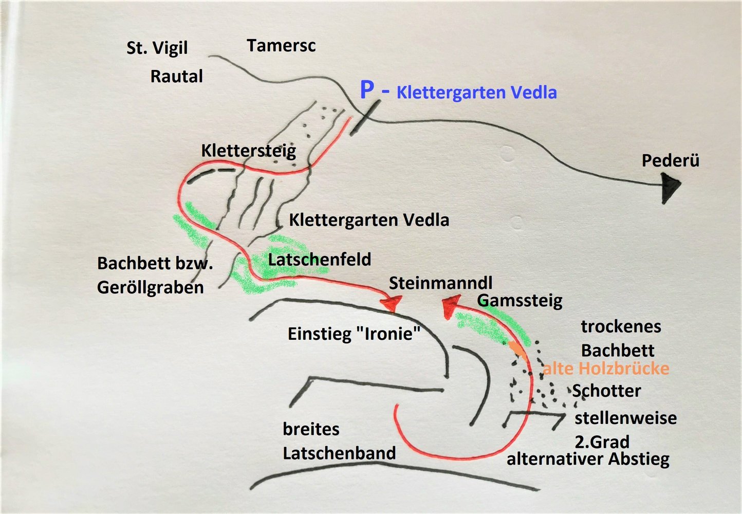Anfahrt von Westen: A22 - Ausfahrt Pustertal - SS49 bis nach St. Lorenzen - rechts ins Gadertal abbiegen bis nach Zwischenwasser - links abzweigen und weiter nach St. Vigil/Enneberg - der Beschilderung folgen und weiter durch das Rautal/Val dai Tamersc Richtung Pederü fahren. Nach der flachen Almwise Tamersc über die Brücke fahren und dann rechts beim Schild "Klettergarten" (Vedla)parken.