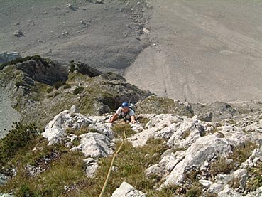 Diese sehr alpine Tour gehört zu den langen Kaisertouren (ca. 600 Hm), man findet alle Arten von Felsqualitäten vor. Der schrofige Vorbau leitet über eine Graspassage in den relativ festen und ausgewaschenen Fels im Mittelteil. In diesem Teil befinden sich auch die Hauptschwierigkeiten 5+ (kann auch 5-/A0 gemacht werden). Danach kommt ein sehr alpines und brüchiges Finale im 3ten Grad. Es handelt sich um eine "leichtere" Tour mit zwei kleineren Überhängen, die man auch technisch (A0) überwinden kann. In zwei Seillängen wird Klettern im 5. Schwierigkeitsgrad gefordert. Die große Wand mit der Route betrachtet man am besten von der Gruttenhütte aus. Die Hütte ist der günstigste Ausgangspunkt - es hängt dort auch ein Übersichtsfoto mit eingezeichneter Route auf (sicherheitshalber auch unseres ausdrucken).