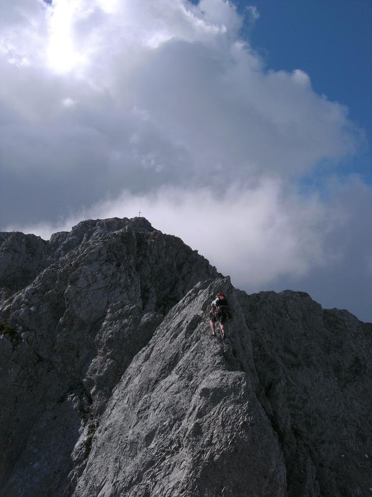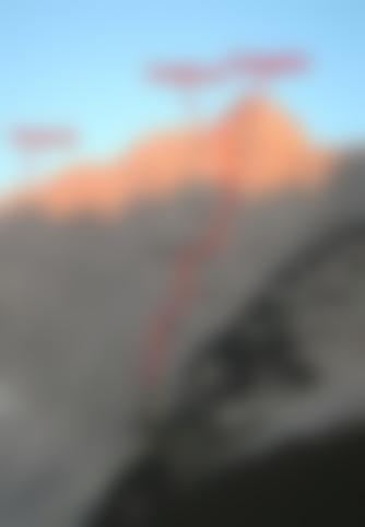 Achtung: Es gibt keinen Fluchtweg in Gipfelnähe des Ostpfeilers. Vorsicht bei unsicherer Wetterlage! Die gebohrten Standplätze ermöglichen jedoch bis zur 13. Seillänge einen halbwegs komfortablen Rückzug (mit Doppelseil).