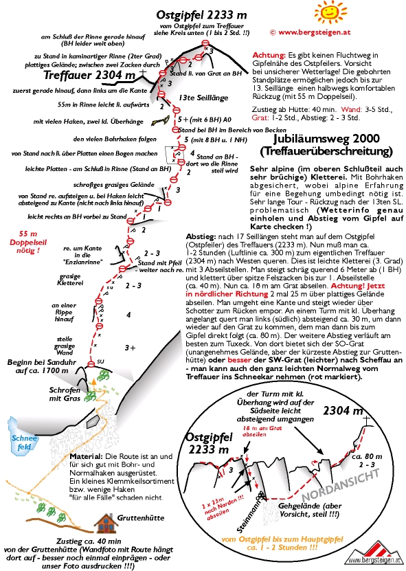 Nach 17 Seillängen steht man auf dem Ostgipfel (Ostpfeiler) des Treffauers (2233 m). Nun muß man ca. 1-2 Stunden (Luftlinie ca. 300 m) zum eigentlichen Treffauer (2306 m) nach Westen queren. Dies ist leichte Kletterei (3. Grad) mit 3 Abseilstellen: man steigt schräg querend 6 Meter ab (1 BH) und klettert über spitze Felszacken bis zur 1. Abseilstelle (ca. 40 m). Nun ca. 18 m am Grat abseilen. Achtung! Jetzt in nördlicher Richtung 2 x 25 m über plattiges Gelände abseilen (bis zu Steinman). Man umgeht eine Kante und steigt wieder über Schotter zum Rücken empor. An einem kleinen Überhang (Gratturm) angelangt quert man links (südlich) absteigend ca. 30 m, um dann wieder auf den Grat zu kommen, dem man dann bis zum Gipfel direkt folgt (80 Hm). Der weitere Abstieg verläuft am besten zum Tuxeck. Von dort bietet sich der SO-Grat (unangenehmes Gelände, aber der kürzeste Abstieg zur Gruttenhütte) oder besser der SW-Grat (leichter) nach Scheffau an bzw. der Normalweg vom Treffauer über das Schneekar zum Jägerwirt (2tes Auto vorteilhaft).