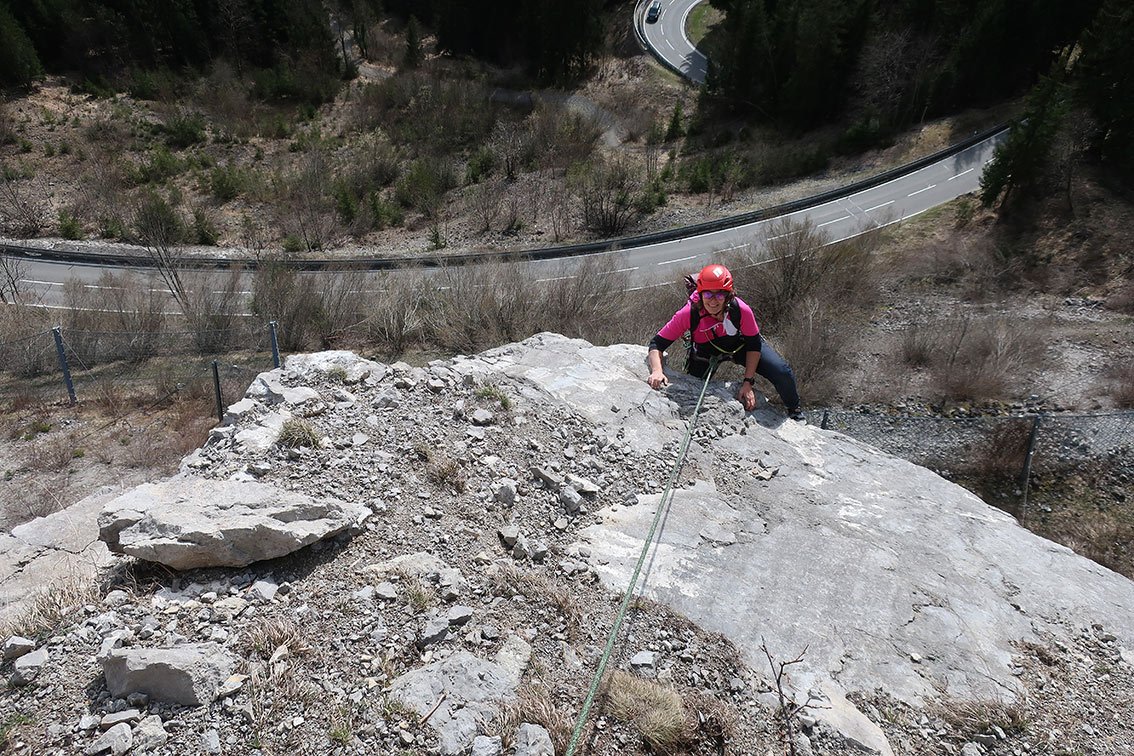 Die Kanzel Südkante ist vermutlich die beste Mehrseillängenroute am eher instabilen Steinbruch nahe dem Oberjoch. Vom Aussichtspunkt Kanzel ist man in wenigen Minuten beim Einstieg und kann sich über die ein oder andere schöne Kletterstelle freuen. Die Tour hat vor allem im Mittelteil steile Seillängen, welche vom Erstbegeher wirklich gut herausgearbeitet wurden. Der Autolärm ist leider störend, dafür hat man aber einen tollen Blick auf die Bergwelt hinter Bad Hindelang.